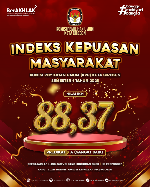 KPU Kota Cirebon meraih predikat A (Sangat Baik) dalam indeks kepuasan masyarakat dengan nilai 88,37. Pencapaian ini menjadi motivasi kami untuk terus berinovasi demi pelayanan terbaik dan memberikan pelayanan prima. Terima kasih atas dukungan responden yang telah berpartisipasi.✨ ....