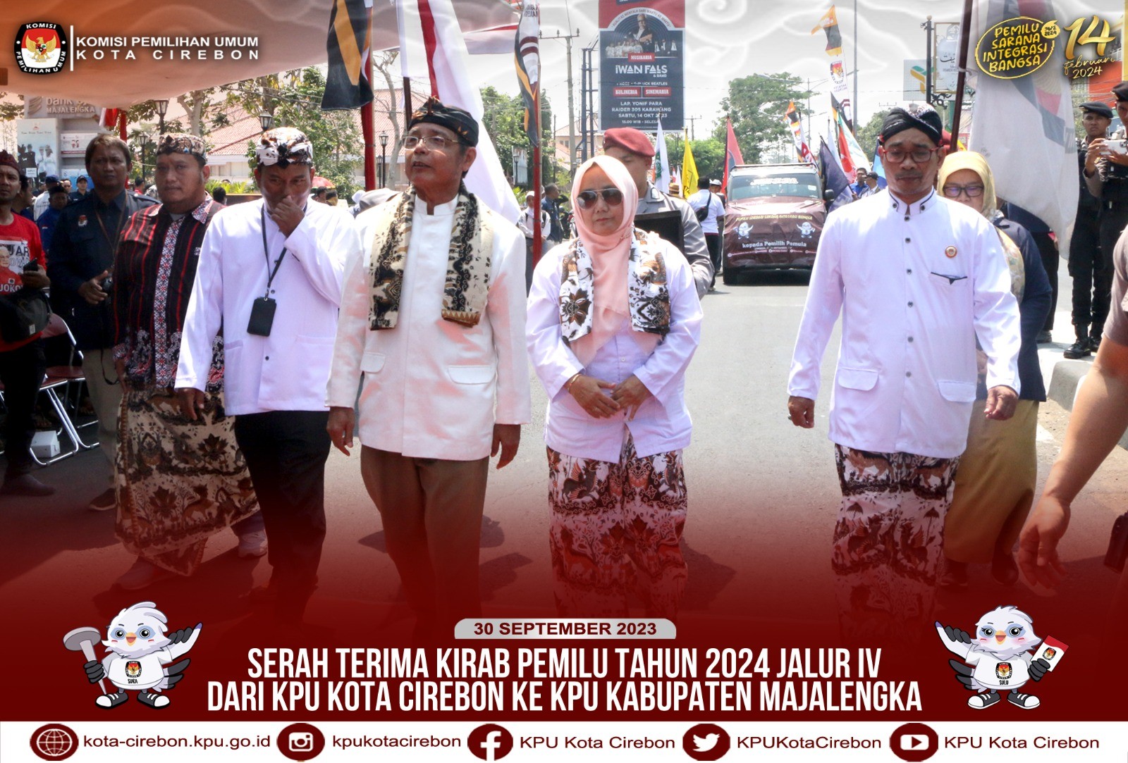 Cirebon, kota-cirebon.kpu.go.id - Pelaksanaan Kirab Pemilu Tahun 2024 Jalur IV di Kota Cirebon pada Hari Kedelapan yang dilaksanakan pada Sabtu, 28 September 2023. Sesuai jadwal, pada hari ini merupakan hari kirab terakhir di Kota Cirebon untuk selanjutnya diserahkan kepada KPU Kabupaten Majalengka. Berikut uraian kegiatan serah terima Kirab Pemilu 2024 ke KPU Kabupaten Majalengka. Rombongan Serah Terima Kirab Pemilu Tahun 2024 ke KPU Kabupaten Majalengka diikuti oleh Ketua dan Anggota KPU Kota Cirebon, Sekretariat KPU Kota Cirebon, Jagat saksana.