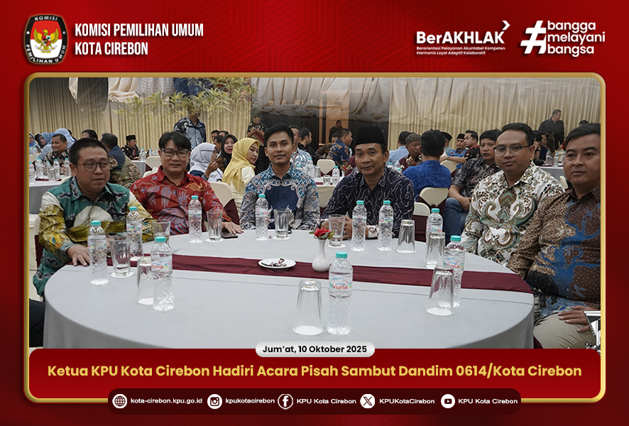 CIREBON – Ketua Komisi Pemilihan Umum (KPU) Kota Cirebon, Mardeko, menghadiri acara Pisah Sambut Komandan Kodim (Dandim) 0614/Kota Cirebon dari Letkol Inf Saputra Hakki, S.H., M.P.M. kepada Letkol Arm Drajat Santoso, S.Kom. Acara berlangsung dengan penuh khidmat dan kebersamaan di Ballroom Grage Hotel Cirebon, pada Jumat (10/10/2025).