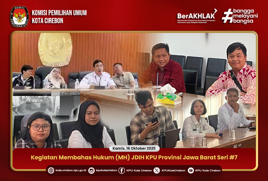 CIREBON, 16 Oktober 2025 – Komisi Pemilihan Umum (KPU) Kota Cirebon mengikuti kegiatan Membahas Hukum (MH) Jaringan Dokumentasi dan Informasi Hukum (JDIH) KPU Provinsi Jawa Barat Seri #7 yang mengangkat tema “Tata Cara Pembuatan Abstrak Keputusan, Resume Putusan, dan Ketentuan Pengelolaan Media Sosial KPU Provinsi dan KPU Kabupaten/Kota”. Kegiatan ini diselenggarakan secara daring pada Kamis (16/10/2025) dan diikuti oleh jajaran Subbagian Hukum KPU Kabupaten/Kota se-Jawa Barat.
