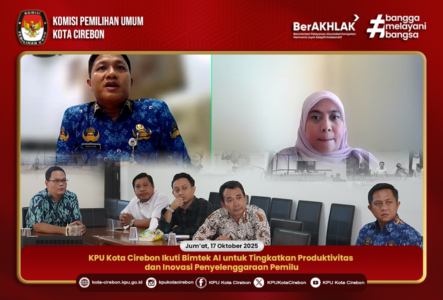 CIREBON, 17 Oktober 2025 – Komisi Pemilihan Umum (KPU) Kota Cirebon mengikuti Kegiatan Bimbingan Teknis (Bimtek) bertema “Kerja Cerdas Meningkatkan Produktivitas Menggunakan Kecerdasan Buatan (Artificial Intelligence/AI)” yang diselenggarakan oleh KPU Republik Indonesia secara daring, pada Jumat (17/10/2025). Kegiatan ini diikuti oleh jajaran Sekretariat KPU Provinsi/KIP Aceh serta KPU/KIP Kabupaten/Kota di seluruh Indonesia.