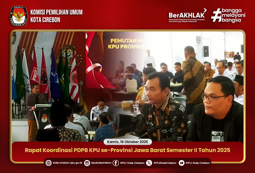 CIREBON, 16 Oktober 2025 – Komisi Pemilihan Umum (KPU) Kota Cirebon menghadiri Rapat Koordinasi KPU se-Provinsi Jawa Barat Semester II Tahun 2025, yang diselenggarakan oleh Badan Kesatuan Bangsa dan Politik (Kesbangpol) Provinsi Jawa Barat pada Kamis (16/10/2025). Kegiatan ini mengangkat tema sentral “Pemutakhiran Data Pemilih Berkelanjutan.”
