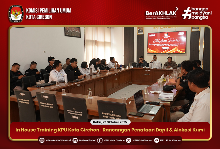 CIREBON – Komisi Pemilihan Umum (KPU) Kota Cirebon menyelenggarakan In House Training dengan tema “Rancangan Penataan Daerah Pemilihan (Dapil) & Alokasi Kursi Anggota DPRD Kota Cirebon dalam Pemilu Tahun 2024”, bertempat di lingkungan KPU Kota Cirebon pada Rabu (22/10/2025).