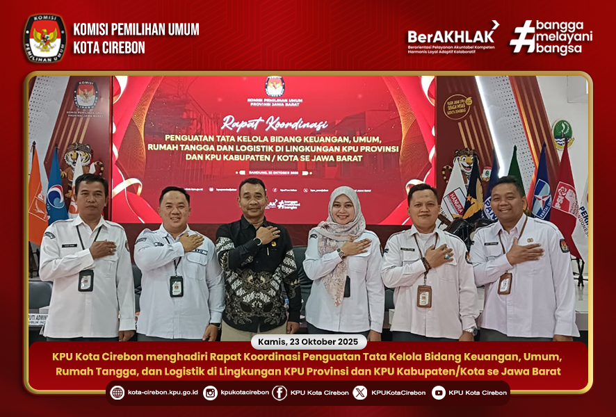 BANDUNG - Komisi Pemilihan Umum (KPU) Kota Cirebon menghadiri Rapat Koordinasi Penguatan Tata Kelola Bidang Keuangan, Umum, Rumah Tangga, dan Logistik yang diselenggarakan oleh KPU Provinsi Jawa Barat pada Kamis (23/10/2025).
