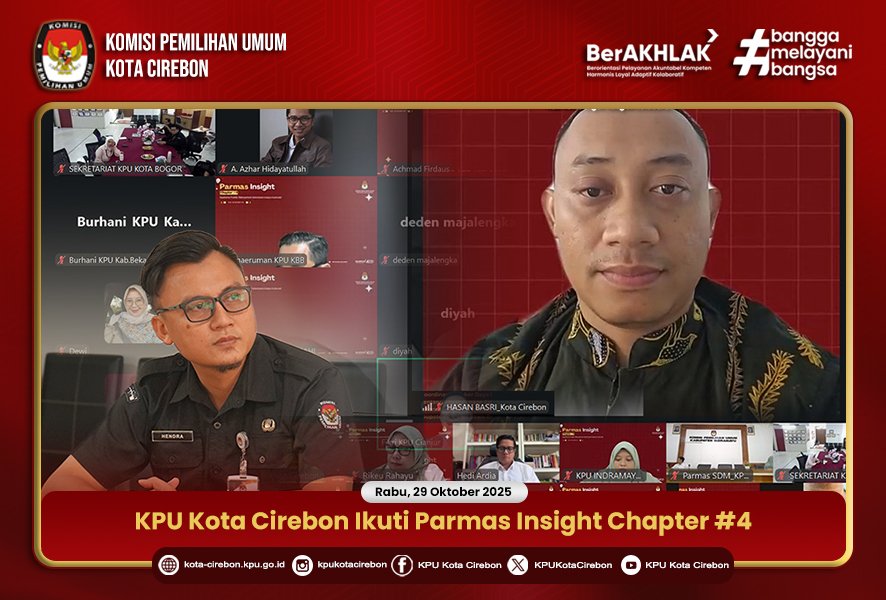 CIREBON, 29 Oktober 2025 – Komisi Pemilihan Umum (KPU) Kota Cirebon melalui Ketua Divisi Sosialisasi, Pendidikan Pemilih, Partisipasi Masyarakat, dan SDM Hasan Basri, bersama Plt. Kasubbag Parmas dan SDM Hendra Gunawan, mengikuti Kegiatan Parmas Insight Chapter #4 dengan tema “Apatisme Publik (Menyentuh Kelompok Golput Kultural)”, yang diselenggarakan secara daring pada Rabu (29/10/2025).