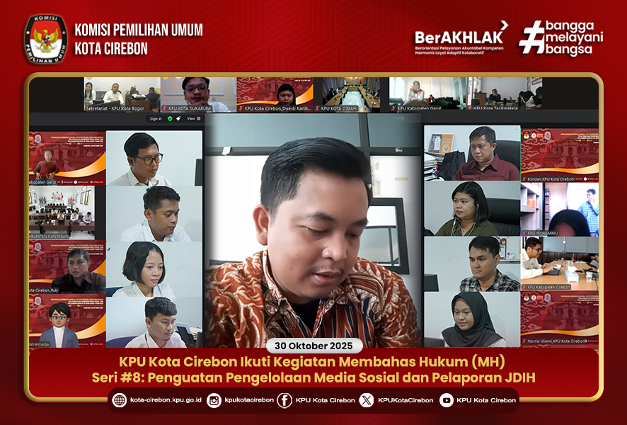 CIREBON, 30 Oktober 2025 – Komisi Pemilihan Umum (KPU) Kota Cirebon mengikuti kegiatan Membahas Hukum (MH) Jaringan Dokumentasi dan Informasi Hukum (JDIH) KPU Provinsi Jawa Barat Seri #8, yang mengangkat topik “Pelaporan dan Pengecekan Media Sosial JDIH KPU Kabupaten/Kota se-Jawa Barat Tahun 2025”, pada Kamis (30/10/2025) secara daring.