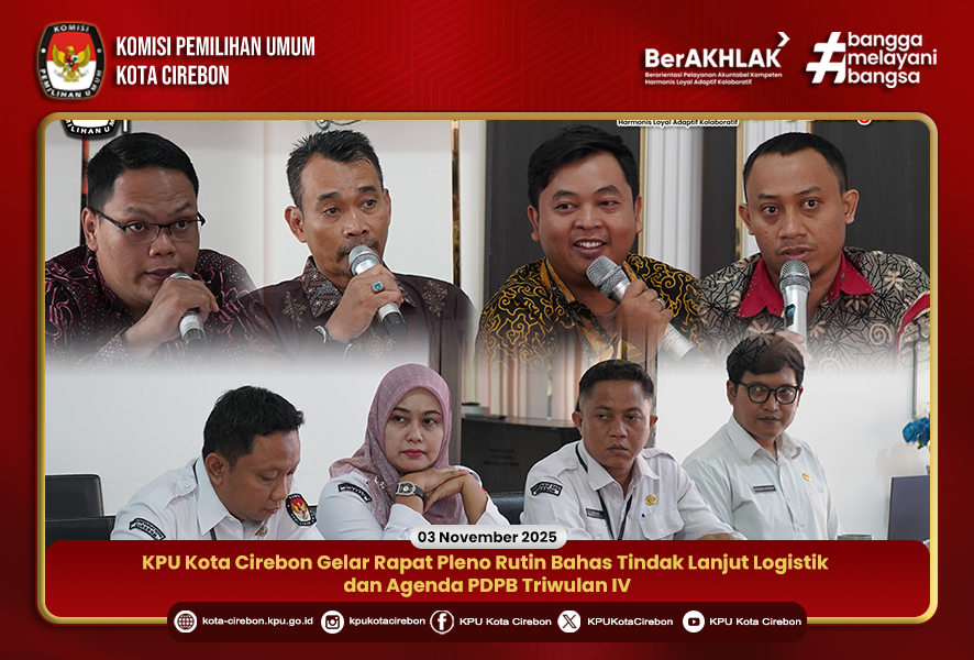 CIREBON, 3 November 2025 – Komisi Pemilihan Umum (KPU) Kota Cirebon menggelar Rapat Pleno Rutin di Kantor KPU Kota Cirebon pada Senin (3/11/2025).