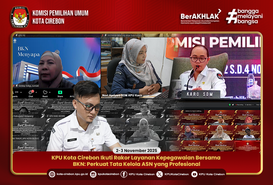 CIREBON, 2–3 November 2025 – Komisi Pemilihan Umum (KPU) Kota Cirebon mengikuti Rapat Koordinasi (Rakor) Layanan Kepegawaian dengan Badan Kepegawaian Negara (BKN) di lingkungan Sekretariat Jenderal KPU, yang diselenggarakan secara daring selama dua hari, Minggu–Senin (2–3/11/2025).