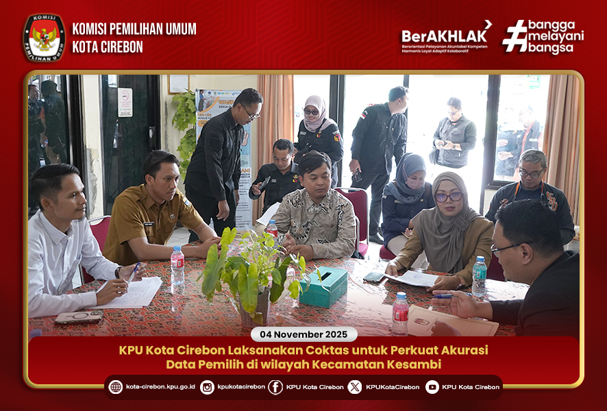 CIREBON, 4 November 2025 – Komisi Pemilihan Umum (KPU) Kota Cirebon melaksanakan kegiatan Pencocokan dan Penelitian Terbatas (Coktas) terhadap data pemilih di wilayah Kecamatan Kesambi, pada Selasa (4/11/2025). Kegiatan ini dilaksanakan dalam rangka menindaklanjuti ketentuan Peraturan Komisi Pemilihan Umum (PKPU) Nomor 1 Tahun 2025 serta Surat Edaran Ketua KPU Nomor: 1577/PP.05-SD/13/2025 tanggal 10 September 2025 tentang Persiapan Penyusunan Daftar Pemilih Berkelanjutan (PDPB) Triwulan IV Tahun 2025.