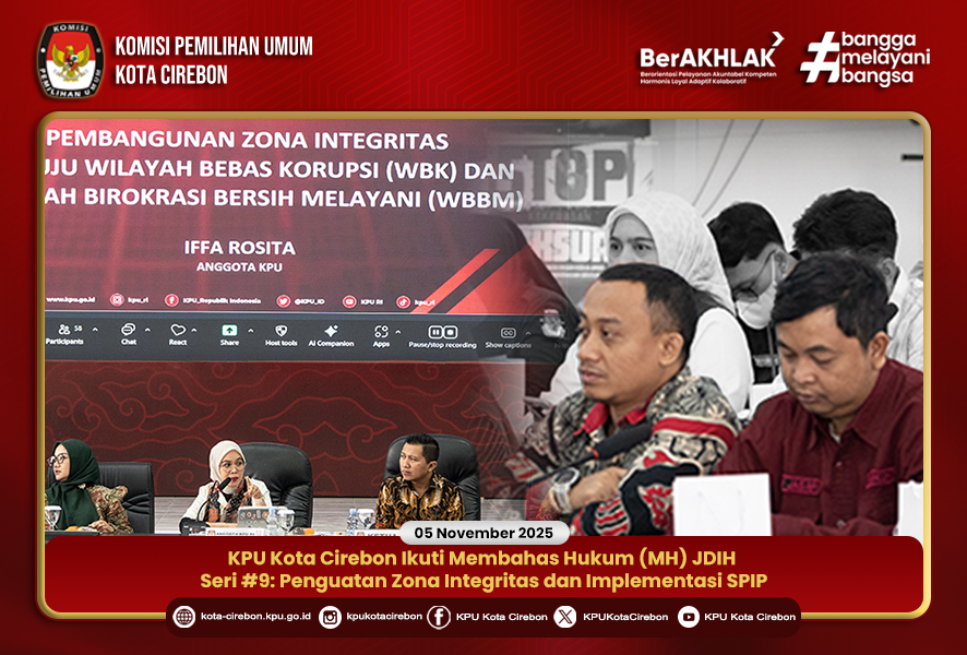 CIREBON, 5 November 2025 – Komisi Pemilihan Umum (KPU) Kota Cirebon menghadiri kegiatan Membahas Hukum (MH) Jaringan Dokumentasi dan Informasi Hukum (JDIH) KPU Provinsi Jawa Barat Seri #9, dengan topik “Sosialisasi Pembangunan Zona Integritas dan Keputusan KPU Nomor 855 Tahun 2025 tentang Pedoman Teknis Penyelenggaraan Sistem Pengendalian Intern Pemerintah (SPIP) di KPU, KPU Provinsi, dan KPU Kabupaten/Kota.”