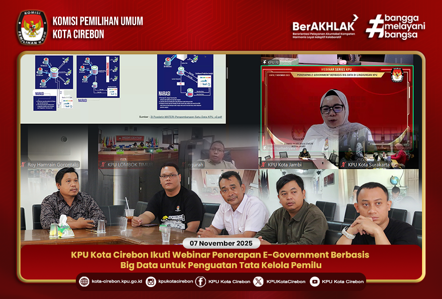 CIREBON, 7 November 2025 – Komisi Pemilihan Umum (KPU) Kota Cirebon mengikuti Webinar Penerapan E-Government Berbasis Big Data di Lingkungan Komisi Pemilihan Umum, yang diselenggarakan secara daring pada Jumat (7/11/2025). Kegiatan ini merupakan bagian dari upaya KPU RI dalam mendorong transformasi digital dan modernisasi tata kelola kelembagaan, khususnya dalam pengelolaan data pemilu yang akurat, efisien, dan transparan.