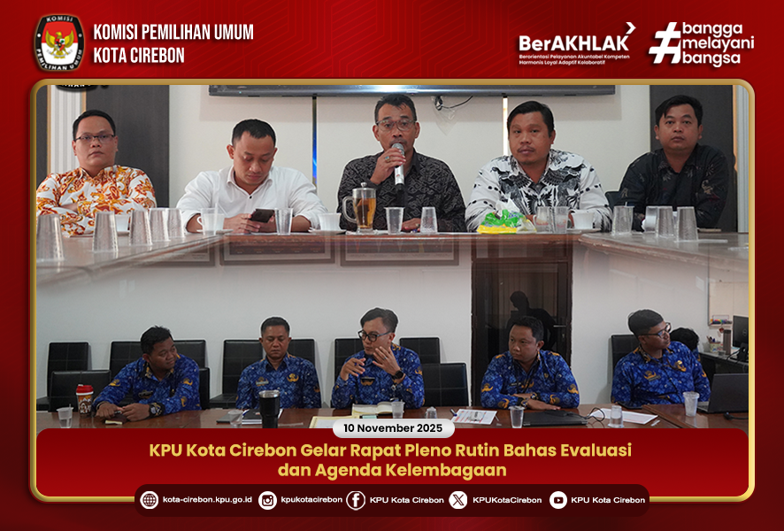 CIREBON, 10 November 2025 – Komisi Pemilihan Umum (KPU) Kota Cirebon melaksanakan Rapat Pleno Rutin di lingkungan Kantor KPU Kota Cirebon, pada Senin (10/11/2025). Kegiatan yang berlangsung di ruang rapat utama ini dipimpin langsung oleh Ketua KPU Kota Cirebon, Mardeko, dan diikuti oleh seluruh anggota KPU serta jajaran sekretariat.