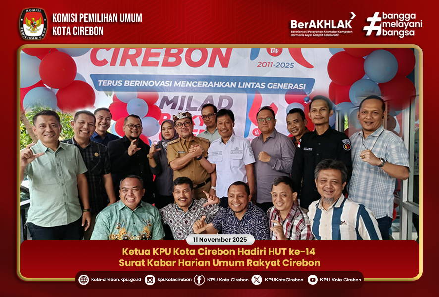 CIREBON, 11 November 2025 – Ketua Komisi Pemilihan Umum (KPU) Kota Cirebon, Mardeko, menghadiri acara peringatan Hari Ulang Tahun ke-14 Surat Kabar Harian Umum Rakyat Cirebon, yang bertempat di Kantor Rakyat Cirebon, Jalan Perjuangan No. 99, Majasem, Kota Cirebon, pada Selasa (11/11/2025).
