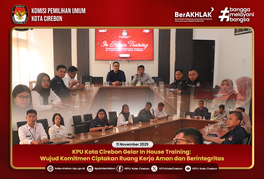 CIREBON, November 2025 – Komisi Pemilihan Umum (KPU) Kota Cirebon menggelar In House Training bertema “Pencegahan dan Penanganan Kekerasan Seksual di Lingkungan Kerja”, bertempat di ruang rapat Kantor KPU Kota Cirebon, Senin (10/11/2025). Kegiatan ini menjadi salah satu bentuk nyata komitmen KPU Kota Cirebon dalam mewujudkan lingkungan kerja yang aman, nyaman, dan berintegritas bagi seluruh jajaran.