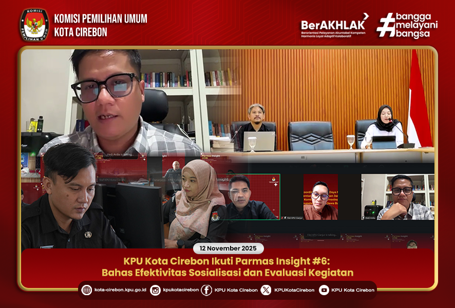 CIREBON, 12 November 2025 – Komisi Pemilihan Umum (KPU) Kota Cirebon mengikuti Kegiatan Parmas Insight Chapter #6 yang diselenggarakan secara daring pada Rabu (12/11/2025). Kegiatan kali ini mengangkat tema “Mengukur Efektivitas Sosialisasi (Indikator, Survei, dan Evaluasi Kegiatan)”, sebagai bagian dari upaya KPU Provinsi Jawa Barat untuk meningkatkan kualitas program sosialisasi dan pendidikan pemilih di seluruh wilayah kabupaten/kota.