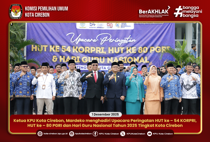 CIREBON – Ketua Komisi Pemilihan Umum (KPU) Kota Cirebon menghadiri Upacara Peringatan Hari Ulang Tahun ke-54 KORPRI, Hari Ulang Tahun ke-80 PGRI, dan Hari Guru Nasional tingkat Kota Cirebon, yang digelar di halaman Balai Kota Cirebon, Senin (1/12/2025). Upacara berlangsung khidmat dan menjadi momentum penting yang menyatukan tiga pilar pelayanan publik dan pendidikan dalam satu peringatan bersama.