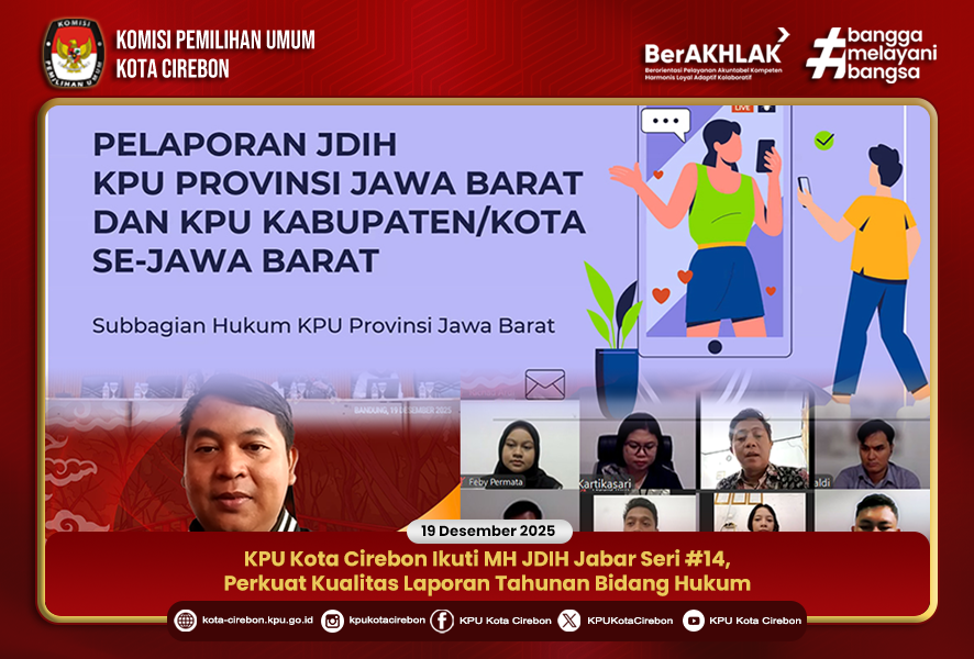 Cirebon – Komisi Pemilihan Umum (KPU) Kota Cirebon mengikuti kegiatan Membahas Hukum (MH) Jaringan Dokumentasi dan Informasi Hukum (JDIH) KPU Provinsi Jawa Barat Seri #14 yang dilaksanakan secara daring pada Jumat, 19 Desember 2025. Kegiatan ini mengangkat tema “Pembahasan Laporan Tahunan di Bidang Hukum Tahun 2025”.