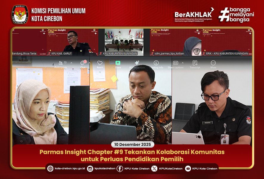 Cirebon – Komisi Pemilihan Umum (KPU) Kota Cirebon mengikuti kegiatan Parmas Insight Chapter #9 yang diselenggarakan oleh KPU Provinsi Jawa Barat secara daring pada Rabu (10/12/2025). Kegiatan ini menjadi ruang berbagi praktik baik dan penguatan strategi sosialisasi guna memperluas jangkauan pendidikan pemilih melalui kolaborasi dengan berbagai komunitas dan kelompok sosial.