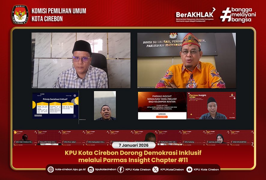 Komisi Pemilihan Umum (KPU) Kota Cirebon turut berkontribusi aktif dalam penguatan demokrasi inklusif melalui partisipasi Ketua Divisi Sosialisasi, Pendidikan Pemilih, Partisipasi Masyarakat, dan SDM, Hasan Basri, sebagai narasumber dalam kegiatan Parmas Insight Chapter #11 bertema “Disabilitas dan Aksesibilitas Pilkada (Sosialisasi Inklusif untuk Pemilih Rentan)”, Rabu (7/1/2026).