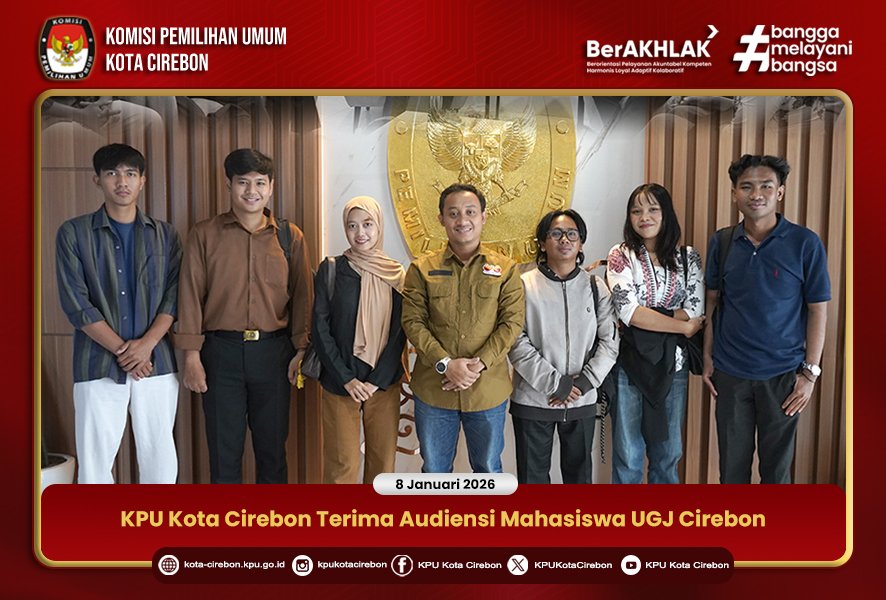 Komisi Pemilihan Umum (KPU) Kota Cirebon menerima kunjungan audiensi mahasiswa Universitas Swadaya Gunung Jati (UGJ) Cirebon, Kamis (8/1/2026), bertempat di Kantor KPU Kota Cirebon. Audiensi ini menjadi ruang dialog konstruktif antara penyelenggara pemilu dan kalangan akademisi dalam rangka memperkuat pemahaman serta partisipasi generasi muda dalam proses demokrasi.