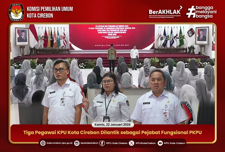 Kota Cirebon – Sebanyak tiga pegawai Komisi Pemilihan Umum (KPU) Kota Cirebon resmi dilantik dan diambil sumpah/janji sebagai Pejabat Fungsional Penata Kelola Pemilihan Umum (PKPU), Kamis (22/1/2026). Pelantikan tersebut dilaksanakan secara daring melalui Zoom Meeting dari Ruang Rapat Pleno KPU Kota Cirebon.