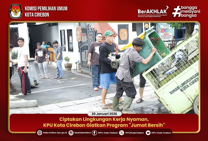 KOTA CIREBON – Komisi Pemilihan Umum (KPU) Kota Cirebon kembali menggalakkan budaya hidup bersih dan sehat di lingkungan kerja melalui kegiatan "Jumat Bersih", Jumat (30/1/2026). Kegiatan gotong royong ini melibatkan seluruh elemen internal, mulai dari jajaran pimpinan, pejabat struktural, hingga staf sekretariat.
