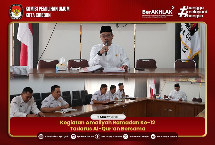 KOTA CIREBON - Dalam rangka mengisi suasana penuh berkah di Bulan Suci Ramadan, serta meningkatkan keimanan, ketakwaan dan membangun suasana kerja yang religius dengan penuh kebersamaan, Selama bulan Ramadan KPU Kota Cirebon melaksanakan kegiatan Tadarus Al-Qur’an secara rutin setiap hari pukul 08.00 – 08.30 WIB di lingkungan kantor KPU Kota Cirebon.