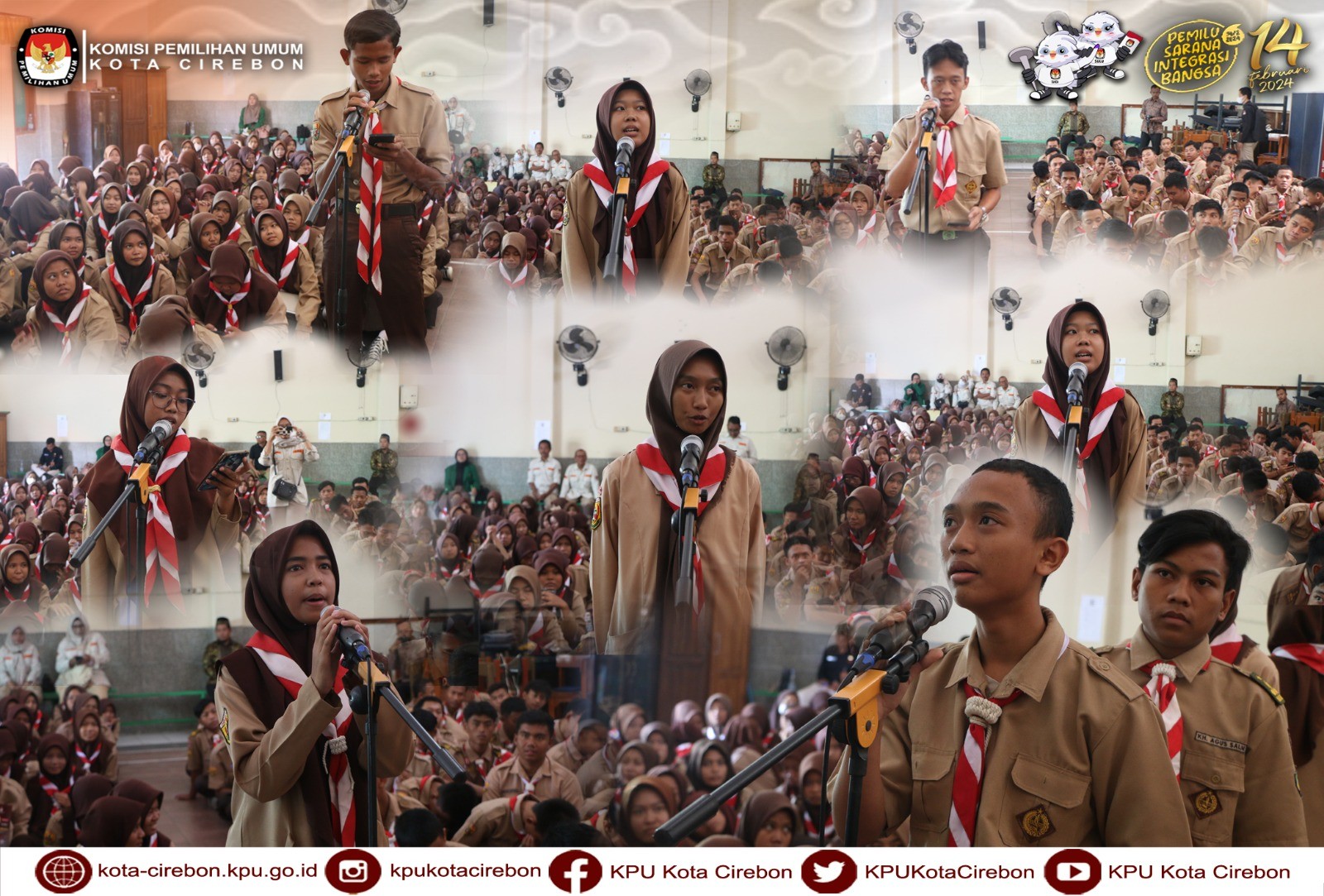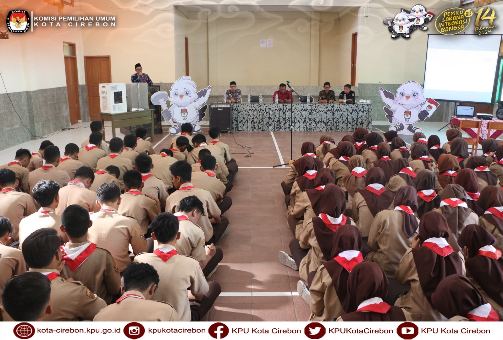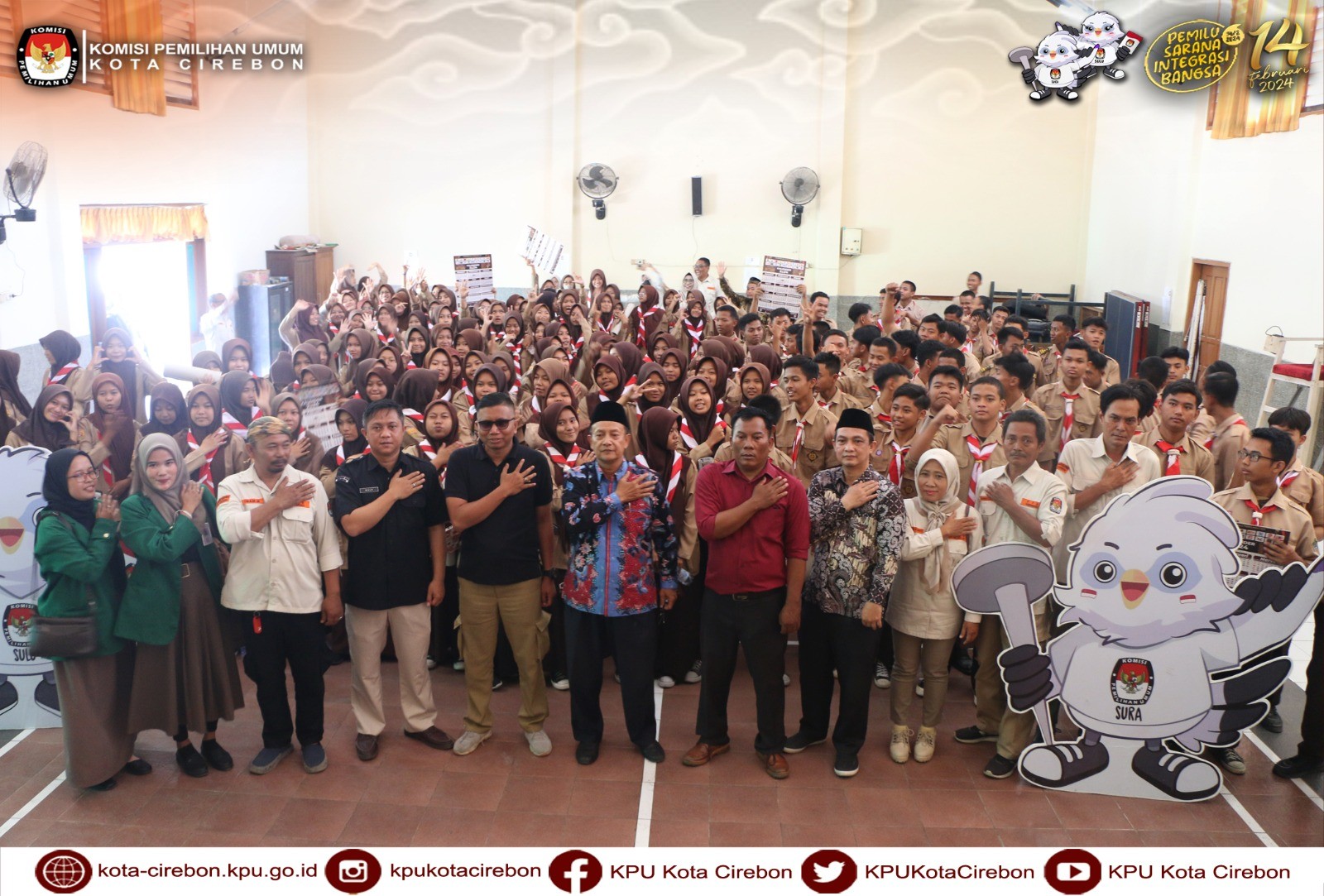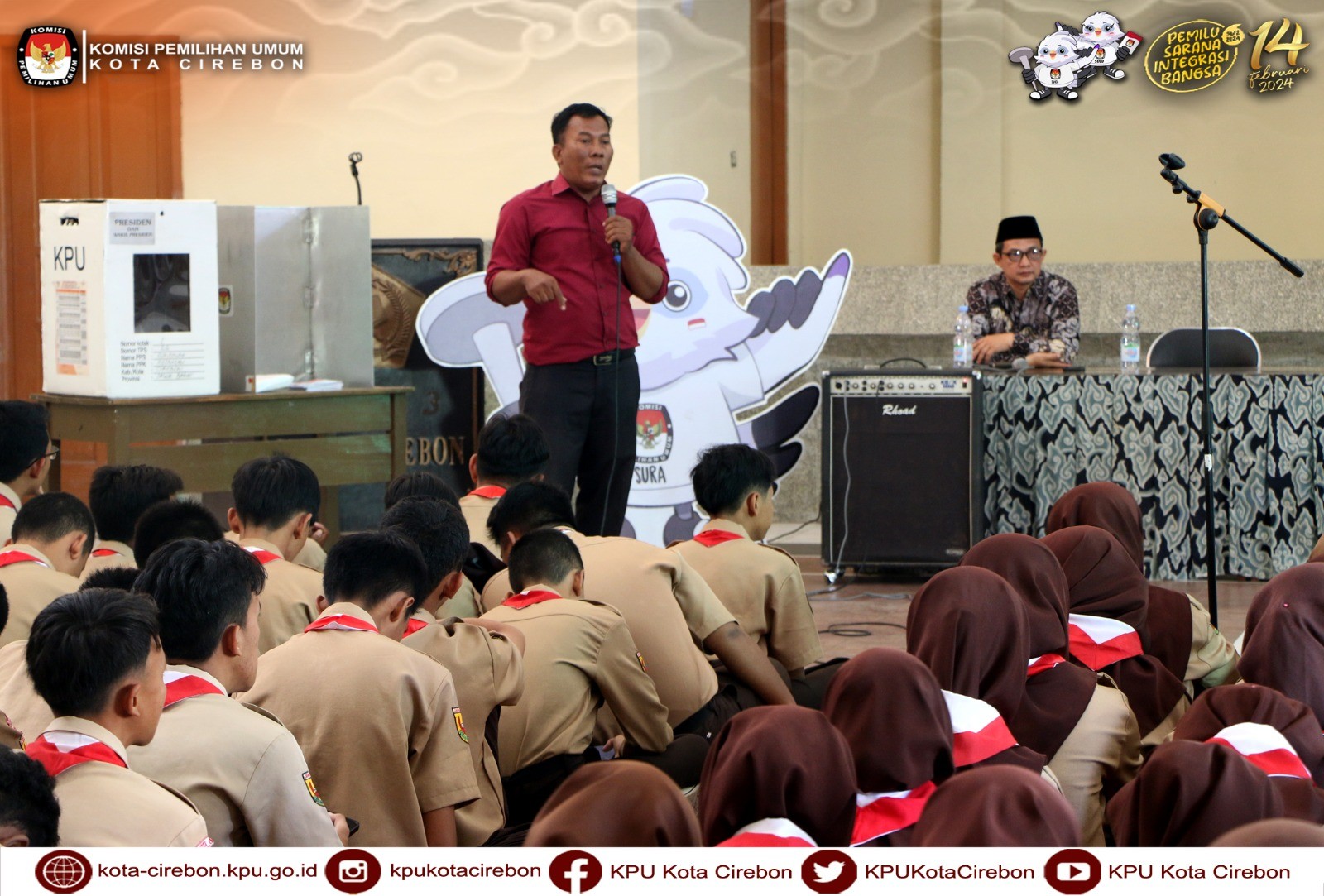Cirebon, kota-cirebon.kpu.go.id - Kegiatan Kirab Pemilu 2024 Hari Kelima, keberangkatan dari Kantor KPU Kota Cirebon Pukul 07.30 WIB, menuju Madrasah Aliyah Negeri 1 Kota Cirebon. Setibanya di Madrasah Aliyah Negeri 1 Kota Cirebon, rombongan kirab disambut oleh Kepala Sekolah, para Guru, dan siswa/i yang sudah menunggu kedatangan rombongan KPU Kota Cirebon. Para siswa/i dikumpulkan di lapangan badminton tertutup milik Madrasah Aliyah Negeri 1 Kota Cirebon, siswa/i yang hadir kurang lebih 210 orang. Kegiatan sosialisasi dibuka dengan sambutan dari Kepala Sekolah dilanjutkan oleh Anggota KPU Kota Cirebon Divisi Sosdiklih Parmas sekaligus pemberi materi. Materi yang disampaikan seputar pendidikan demokrasi dan pelaksanaan Pemilu Serentak Tahun 2024, serta tata cara mencoblos yang benar dengan melakukan simulasi pencoblosan yang melibatkan langsung para siswa/i. Pembagian doorprize juga dilakukan dalam sesi Tanya jawab, bagi siswa/i yang berhasil menjawab pertanyaan sekitar kepemiluan, maka akan diberikan doorprize berupa kalender Pemilu dan juga boneka mini maskot Pemilu Sura Sulu. Sesi terakhir ditutup dengan foto Bersama rombongan KPU Kota Cirebon, PPK, Sekretariat PPK, serta PPS Bersama para siswa/i. Setelah acara sosialisasi rombongan kirab kembali ke Kantor KPU Kota Cirebon.