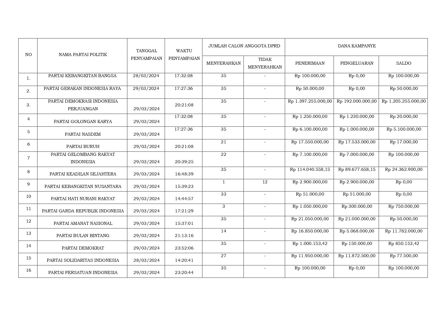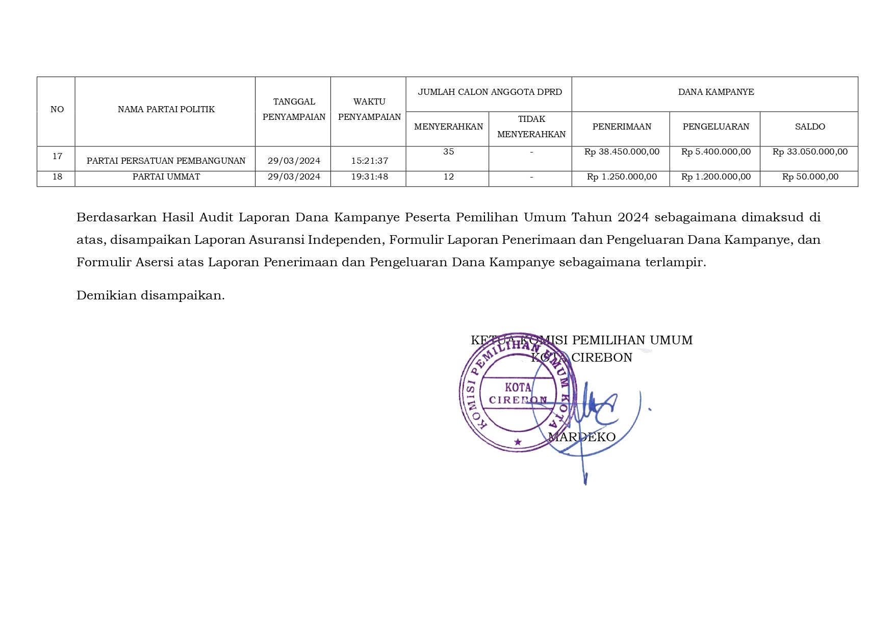 Berdasarkan Laporan Hasil Audit Laporan Dana Kampanye Peserta Pemilihan Umum Tahun 2024 oleh Kantor Akuntan Publik yang telah ditunjuk oleh Komisi Pemilihan Umum Provinsi Jawa Barat, disampaikan Laporan Asuransi Independen, Formulir Laporan Penerimaan dan Pengeluaran Dana Kampanye, dan Formulir Asersi atas Laporan Penerimaan dan Pengeluaran Dana Kampanye sebagaimana terlampir dalam tautan di bawah ini.