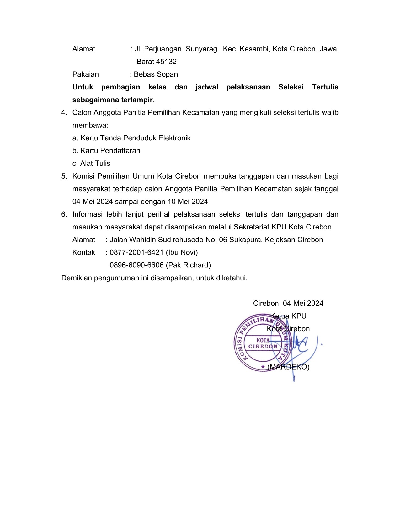 Hasil Penelitian Administrasi dan Jadwal Seleksi Tertulis Calon Anggota PPK Pemilihan Serentak Tahun 2024