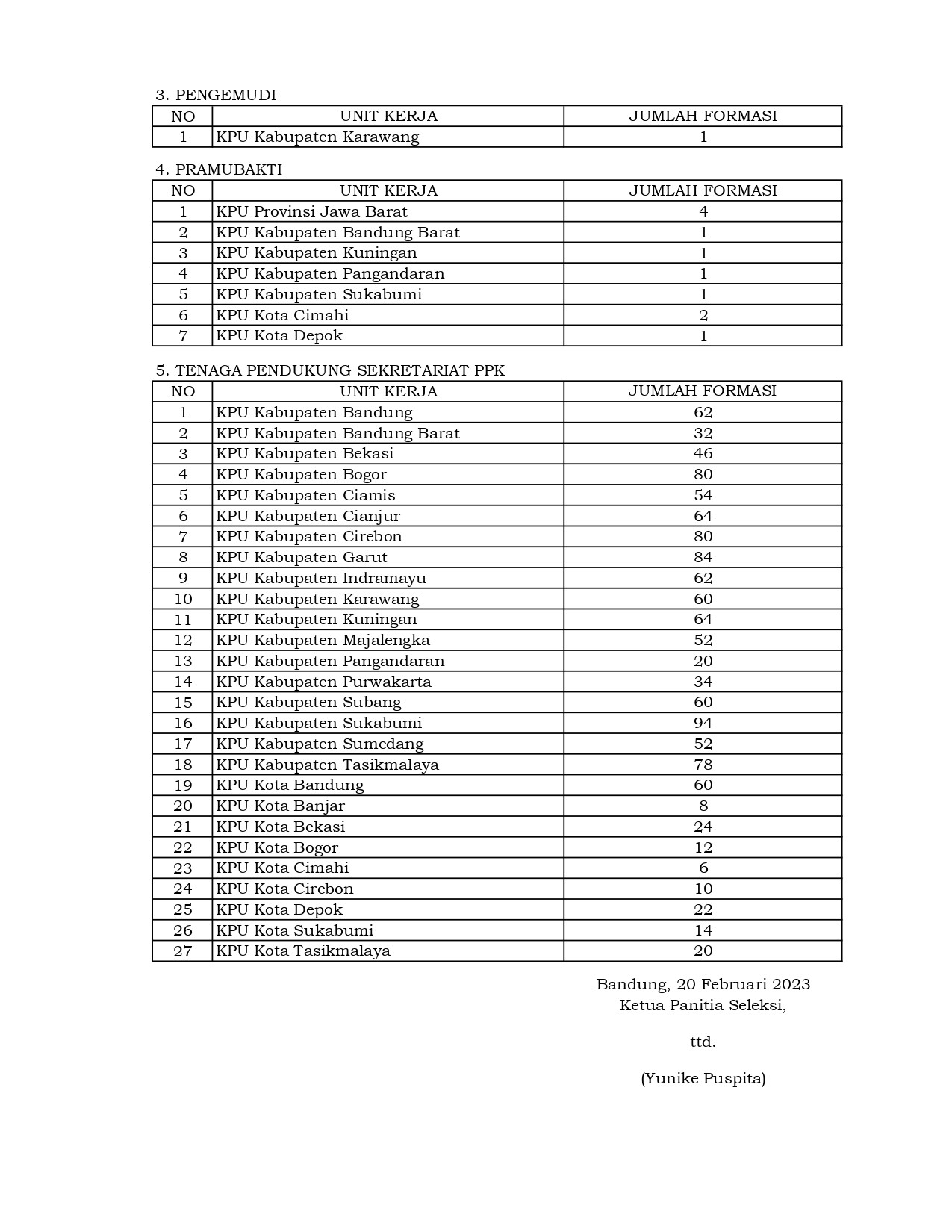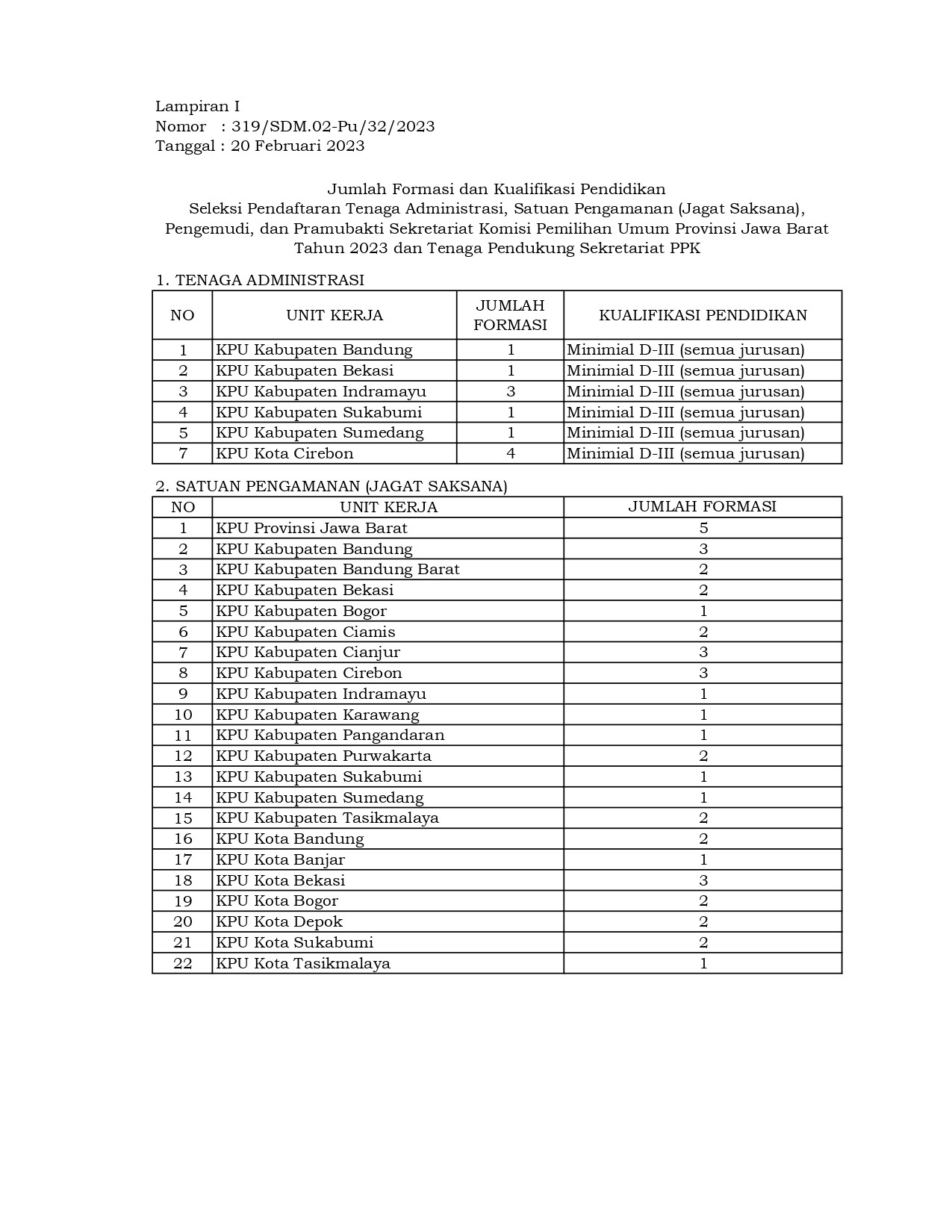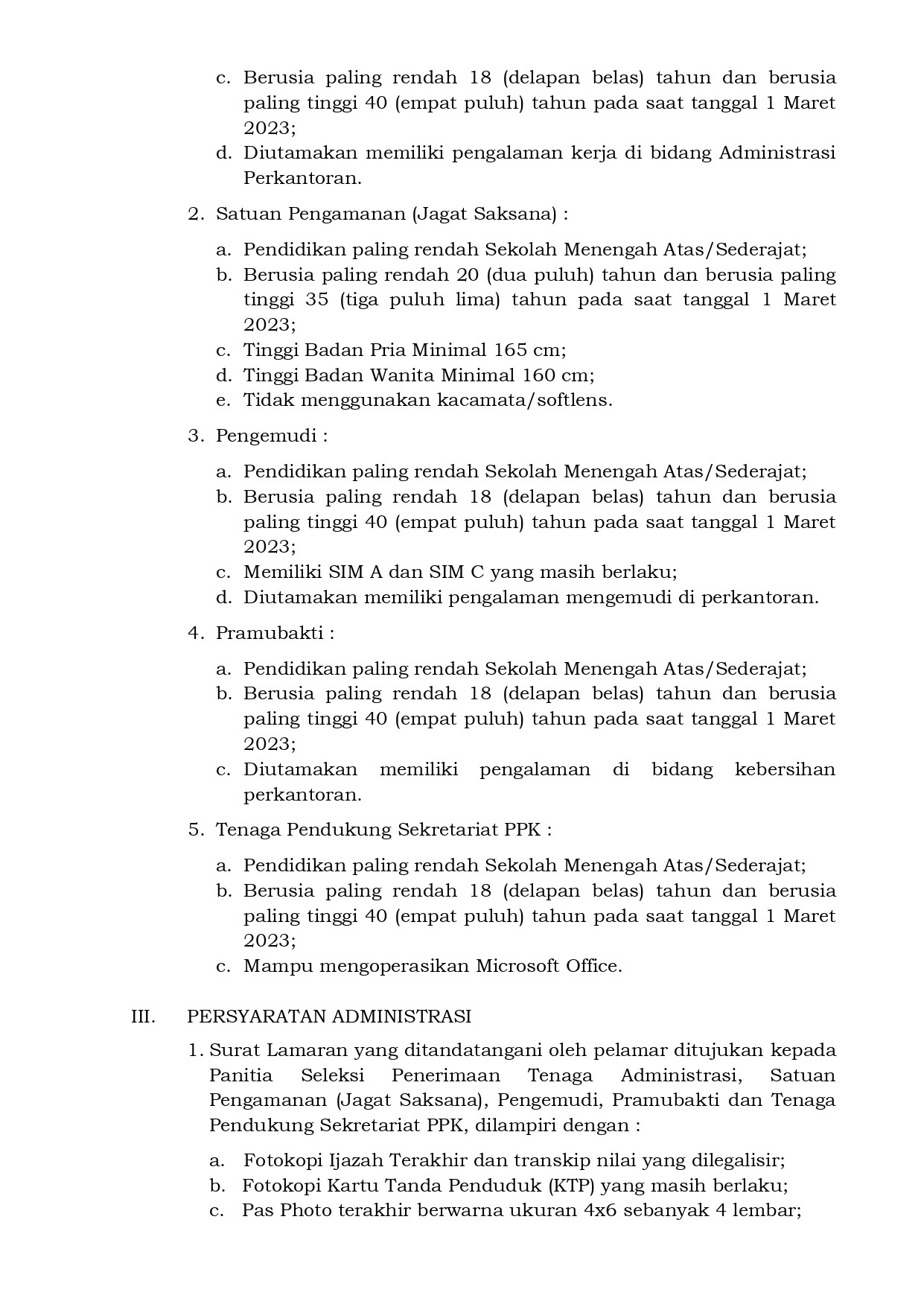 Lowongan Pendaftaran Tenaga Administrasi, Satuan Pengamanan, Pengemudi, Pramubakti, dan Tenaga Pendukung Selasa, 21 Februari 2023 07:00 506 Unduh pengumuman Bagikan: Telah dilihat 506 kali