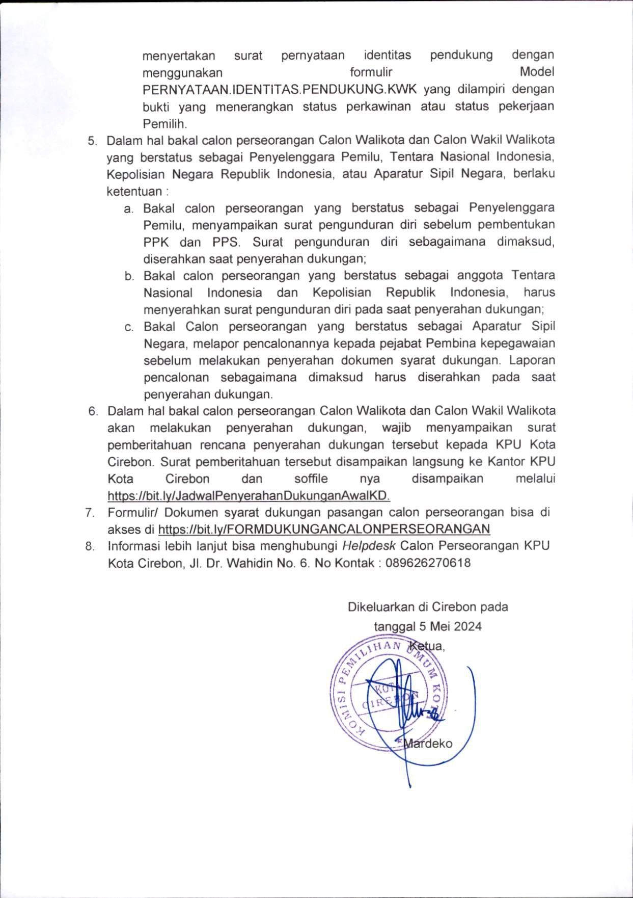 Pencalonan Perseorangan Calon Wali Kota dan Wakil Wali Kota Pada Pemilihan Serentak Tahun 2024 Tingkat Kota Cirebon Minggu, 05 Mei 2024 07:00 130 Unduh Pengumuman Pencalonan Perseorangan Calon Wali Kota dan Wakil Wali Kota Pada Pemilihan Serentak Tahun 2024 Tingkat Kota Cirebon Unduh Formulir Dukungan Calon Perseorangan Bagikan: Telah dilihat 130 kali