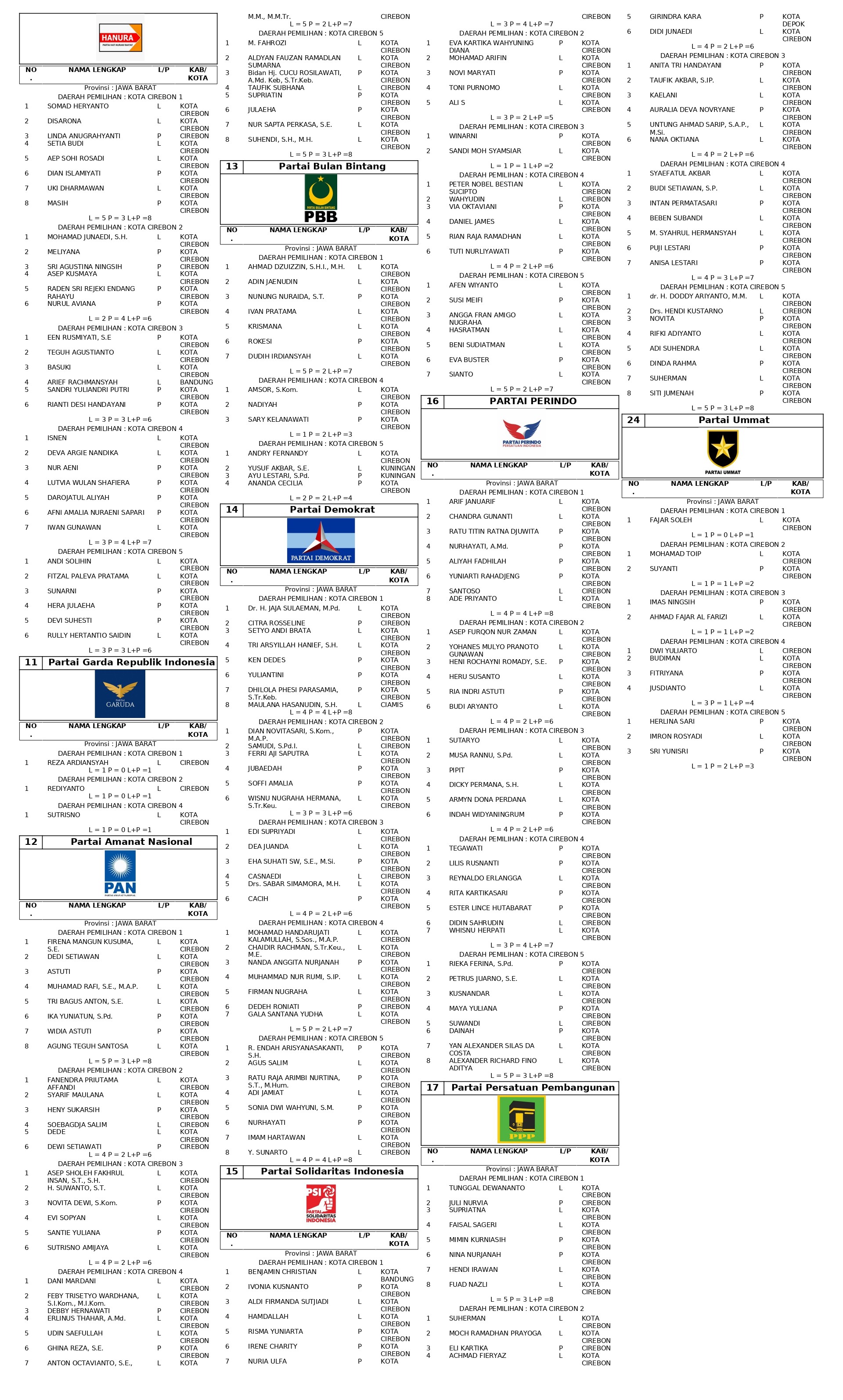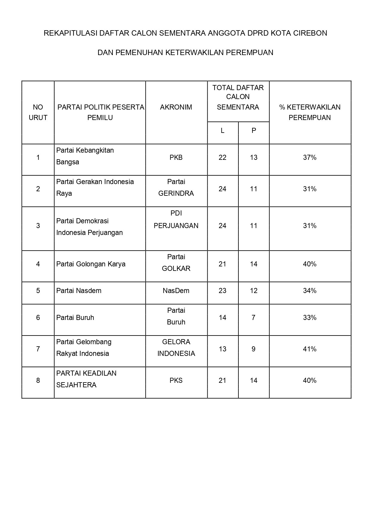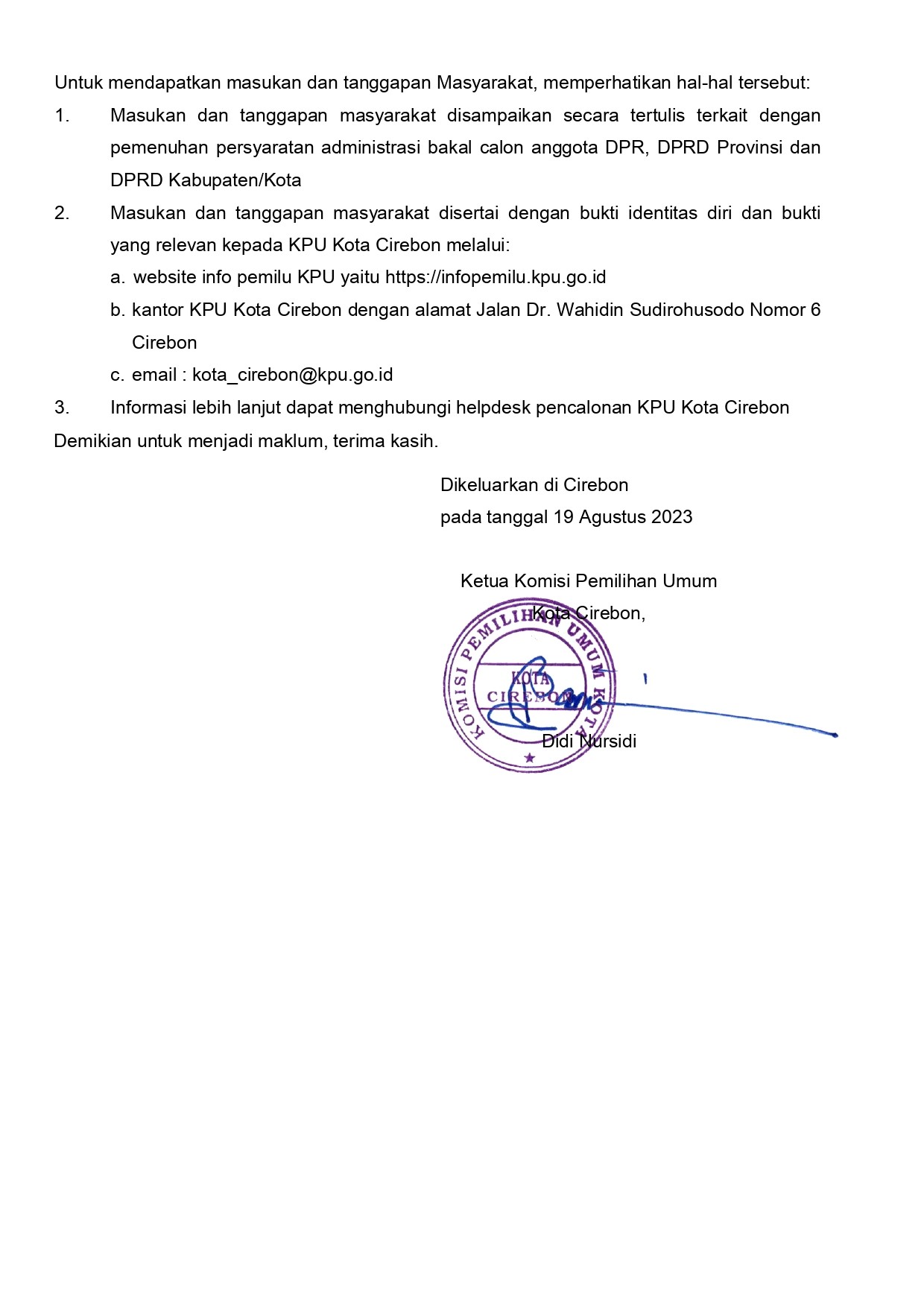 Pengumuman Daftar Calon Sementara Anggota DPRD Kota Cirebon Dalam Pemilihan Umum Tahun 2024 Sabtu, 19 Agustus 2023 00:00 3969 Unduh Pengumuman Daftar Calon Sementara Anggota DPRD Kota Cirebon Dalam Pemilihan Umum Tahun 2024 Unduh Keputusan Daftar Calon Sementara Anggota DPRD Kota Cirebon Dalam Pemilihan Umum Tahun 2024 Bagikan: Telah dilihat 3,969 kali