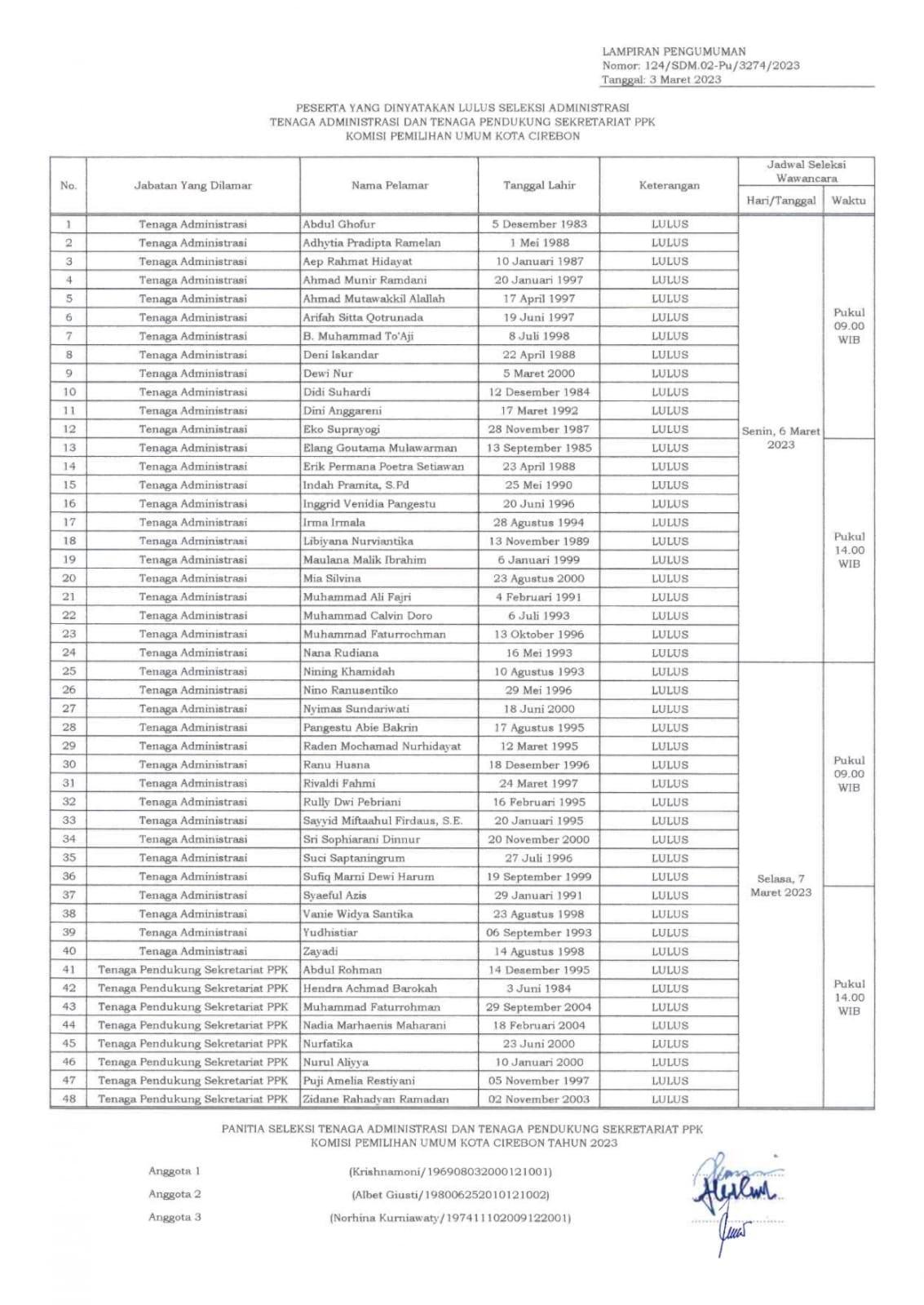 Pengumuman Hasil Seleksi Administrasi Tenaga Administrasi dan Tenaga Pendukung Sekretariat PPK KPU Kota Cirebon Tahun 2023 Jumat, 03 Maret 2023 07:00 336 Unduh pengumuman Bagikan: Telah dilihat 336 kali