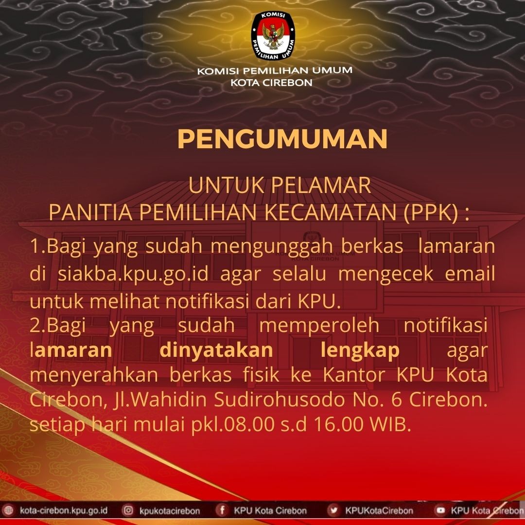 Pengumuman bagi #TemanPemilih yang sudah mengunggah berkas lamaran di siakba.kpu.go.id, agar selalu memeriksa email masuk untuk melihat pemberitahuan dari KPU. Apabila sudah mendapatkan pemberitahuan lamaran dinyatakan lengkap, agar menyerahkan berkas fisik.