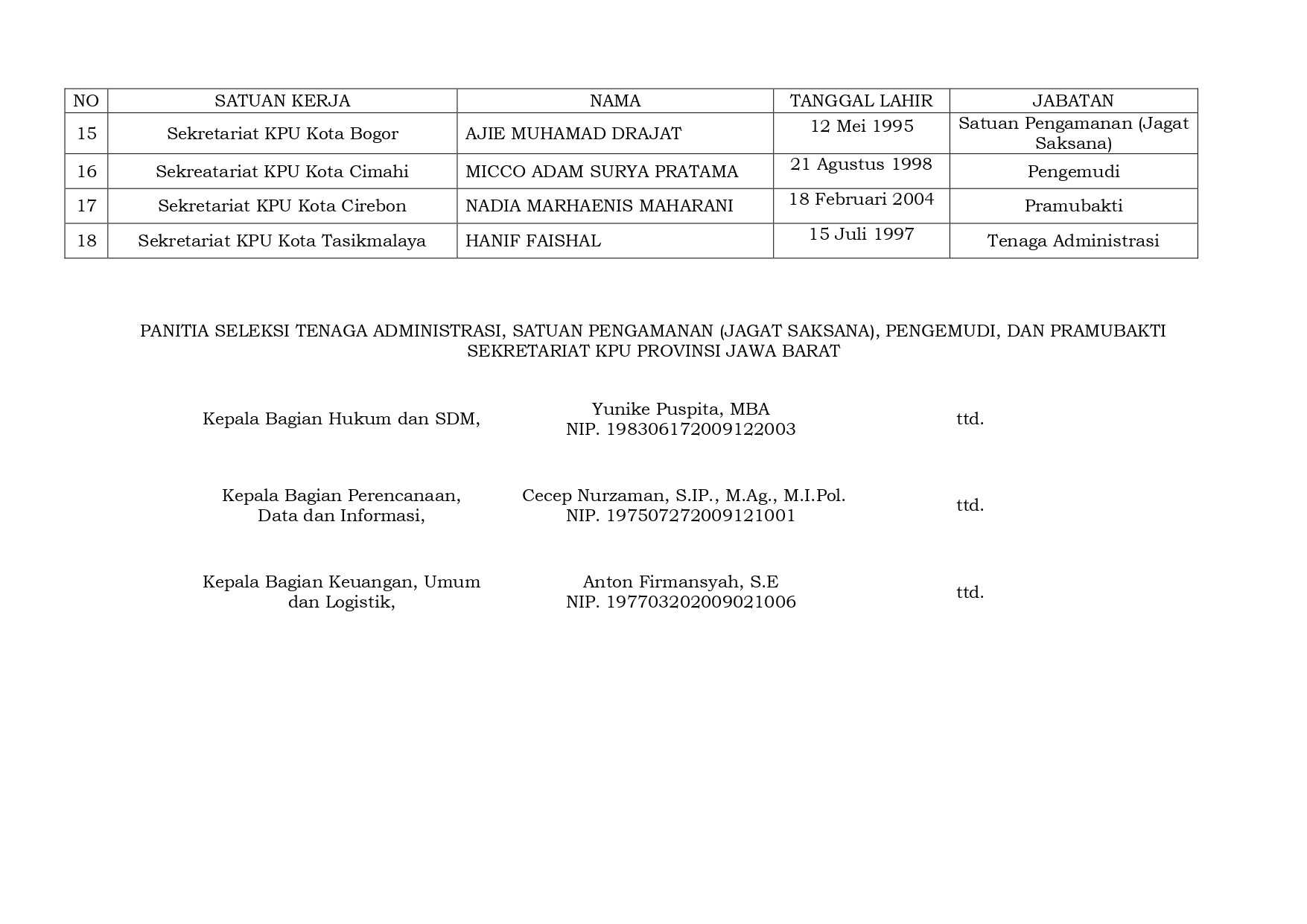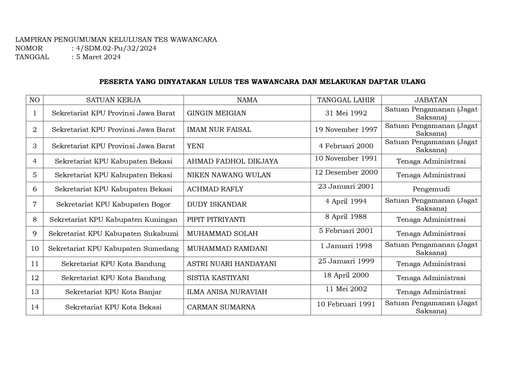 Peserta Yang Dinyatakan Lulus Tes Wawancara Seleksi Pramubakti