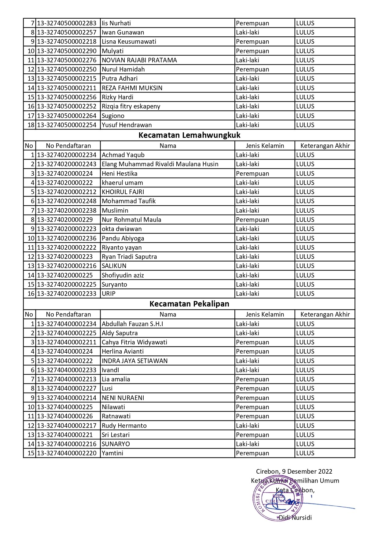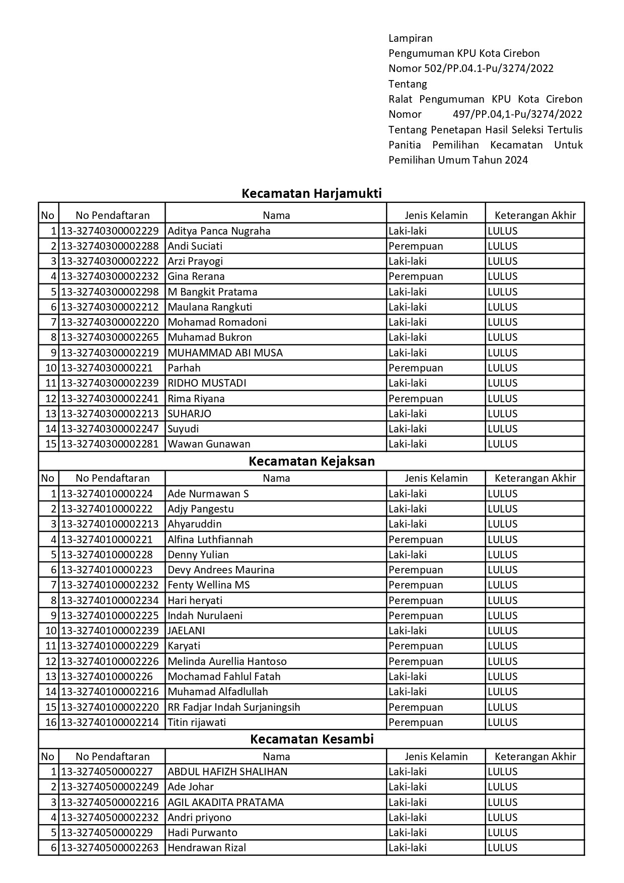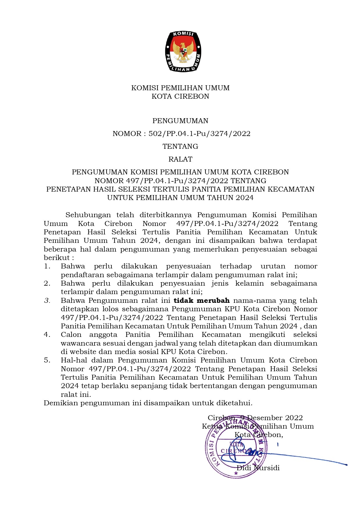 Ralat Pengumuman Penetapan Hasil Seleksi Tertulis Panitia Pemilihan Kecamatan Pemilu 2024