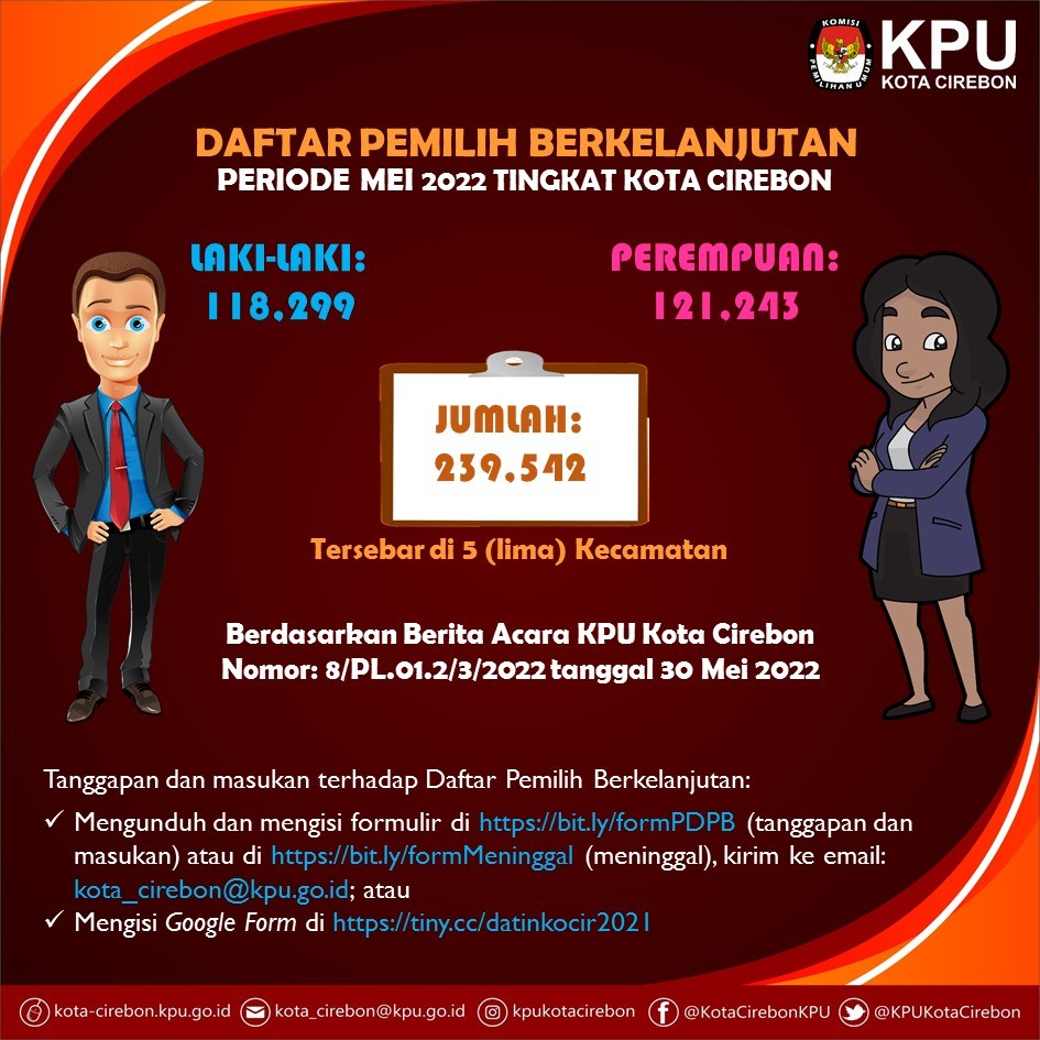 - Mengunduh dan mengisi formulir di https://bit.ly/formPDPB (tanggapan dan masukan) atau di https://bit.ly/formMeninggal, kirim ke email: kota_cirebon@kpu.go.id: atau