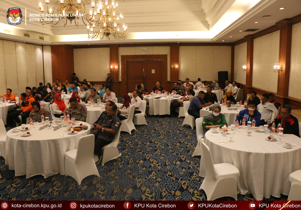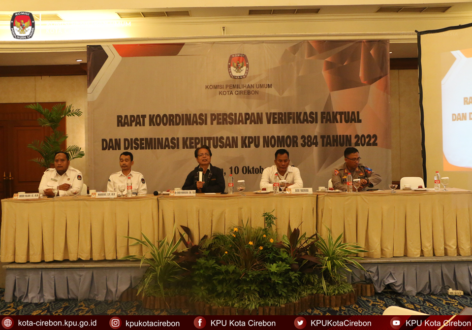 Cirebon, kota-cirebon.kpu.go.id - Berkenaan dengan telah ditetapkannya Keputusan KPU Nomor 384 Tahun 2022 tentang Perubahan Keempat Atas Keputusan KPU Nomor 260 Tahun 2022 Tentang Pedoman Teknis Bagi KPU, KPU Provinsi, dan KPU Kabupaten/Kota Dalam Pelaksanaan Pendaftaran, Verifikasi, dan Penetapan Partai Politik Peserta Pemilu Anggota DPR dan DPRD, KPU Kota Cirebon melakukan Rapat Koordinasi Persiapan Verifikasi Faktual dan Diseminasi Keputusan KPU Nomor 384 Tahun 2022, Senin (10/10). Rapat ini dihadiri Perwakilan dari Kepolisian Resor Cirebon Kota, Bawaslu Kota Cirebon, Disdukcapil Kota Cirebon, Bakesbangpol Kota Cirebon, dan Partai Politik Calon Peserta Pemilu Tahun 2024 se-Kota Cirebon. Acara dibuka oleh Ketua KPU Kota Cirebon, dalam sambutannya terkait tahapan Pemilu yang diharapkan menghasilkan output yang dipahami sesuai prosedur undang-undang dan Peraturan KPU. KPU mendesain dan mengupayakan Pemilu yang berkualitas dan membuat hajat demokrasi yang sukses. Acara dilanjutkan oleh Moderator, Hasbi Falahi, dengan paparan dari narasumber yaitu Ketua Bawaslu Kota Cirebon, Moh. Joharudin. Dalam paparannya, Ketua Bawaslu Kota Cirebon menjelaskan terkait tanggapan masyarakat, dimana masyarakat dapat melaporkan baik ke Bawaslu ataupun ke KPU.