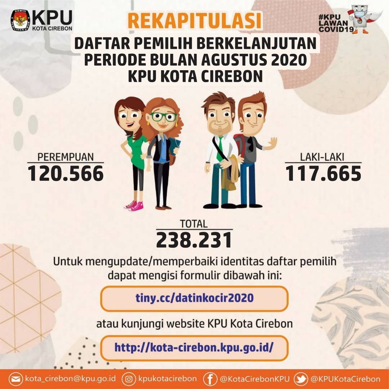 Cirebon, kota-cirebon.kpu.go.id - Komisi Pemilihan Umum (KPU) Kota Cirebon melaksanakan Rapat Pleno Rekapitulasi Daftar Pemilih Berkelanjutan Tahun 2020 periode Bulan Agustus secara daring, Jumat (28/8). Rapat pleno ini diikuti Bawaslu Kota Cirebon, Disdukcapil Kota Cirebon, Kesbangpol DN Kota Cirebon, Polres Cirebon Kota, Kodim 0614 Kota Cirebon, dan Partai Politik se-Kota Cirebon. Rapat pleno ini dilaksanakan dalam rangka menindaklanjuti Surat Edaran Komisi Pemilihan Umum Republik Indonesia Nomor: 181/PL.02.1-SD/01/KPU/II/2020 tentang Pemutakhiran Data Pemilih Berkelanjutan. Komisi Pemilihan Umum (KPU) Kota Cirebon telah menetapkan Rekapitulasi Daftar Pemilih Berkelanjutan Tahun 2020 periode Bulan Agustus dengan jumlah pemilih sebanyak 238.231 (dua ratus tiga puluh delapan ribu dua ratus tiga puluh satu) pemilih, dengan rincian pemilih laki-laki berjumlah 117.665 (seratus tujuh belas ribu enam ratus enam puluh lima) pemilih dan pemilih perempuan berjumlah 120.566 (seratus dua puluh ribu lima ratus enam puluh enam) pemilih.