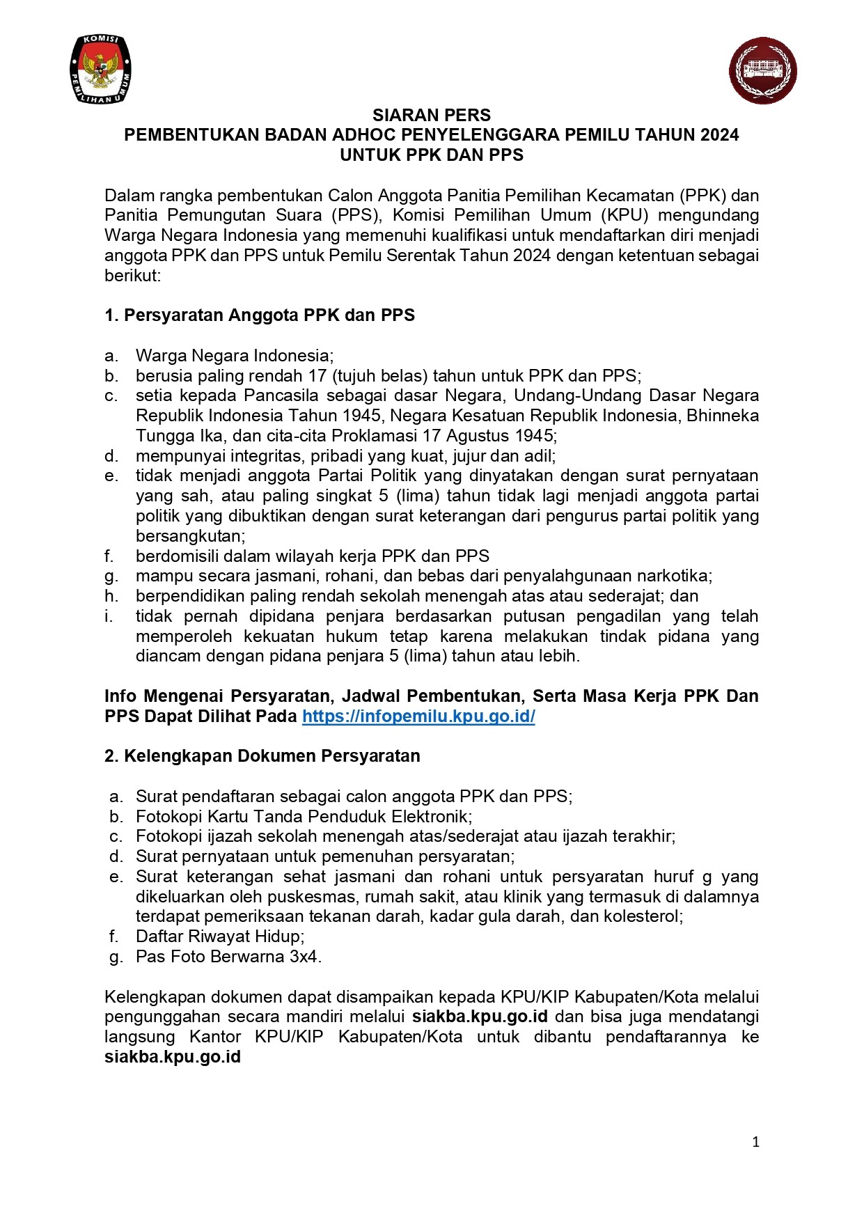 Siaran Pers Pembentukan Badan Adhoc Penyelenggara Pemilu Tahun 2024 Untuk PPK dan PPS