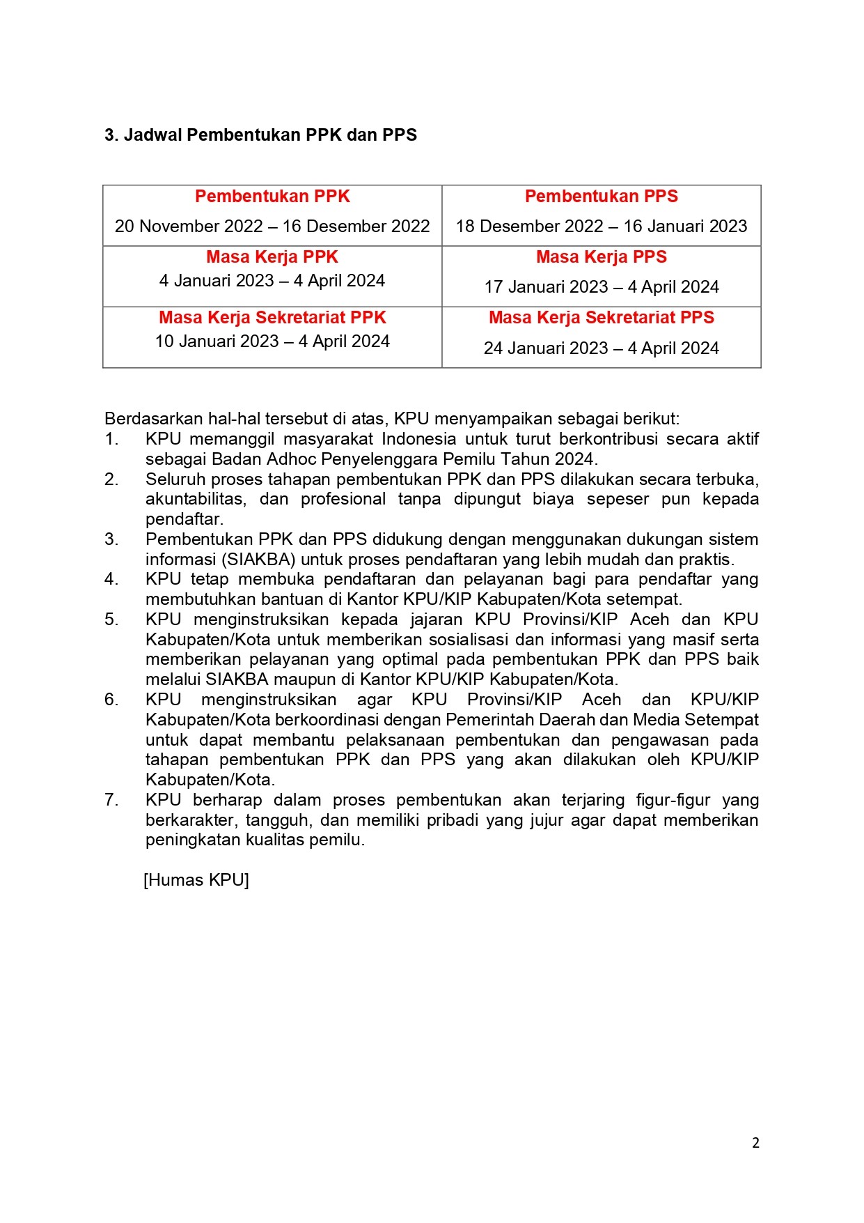 Pada kesempatan itu, Hasyim menyampaikan pembentukan badan ad hoc PPK dan PPS ini dilaksanakan serentak di seluruh Indonesia. Sementara itu, Parsa menjelaskan rekrutmen ini akan dilakukan berkelanjutan, untuk PPK mulai tanggal 20 November sampai 16 Desember 2022, sedangkan untuk PPS mulai tanggal 18 Desember 2022 sampai 16 Januari 2023.