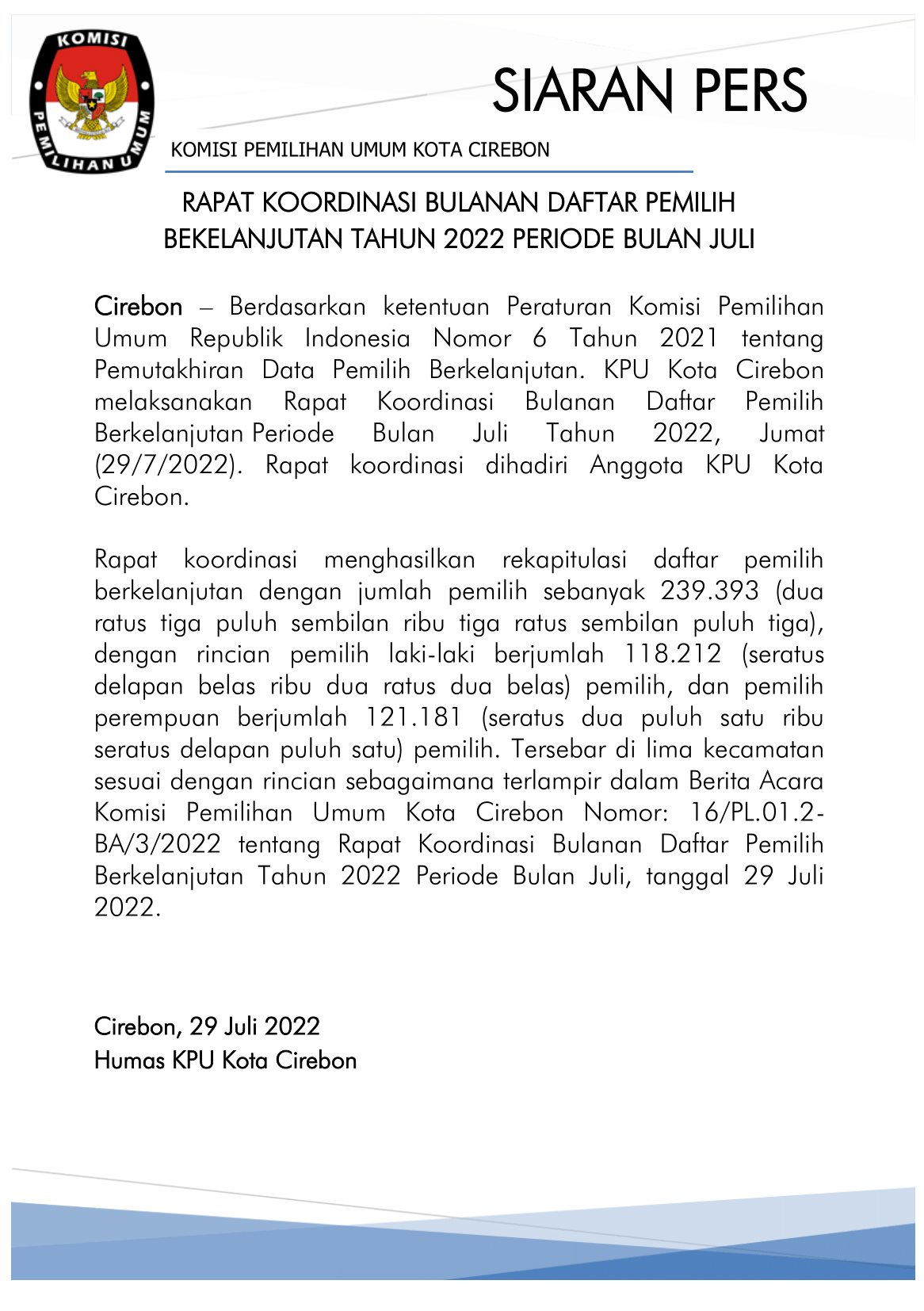 Cirebon, kota-cirebon.kpu.go.id - KPU Kota Cirebon melakukan pertemuan dengan Pengurus DPD Partai Gelora Kota Cirebon, Rabu (27/7/2022). Pertemuan ini dalam rangka Sosialisasi Keputusan KPU RI Nomor 21 Tahun 2022 tentang Hari dan Tanggal Pemungutan Suara pada Pemilihan Umum Presiden dan Wakil Presiden, Anggota DPR, Anggota DPD, Anggota DPRD Provinsi, dan Anggota DPRD Kabupaten/Kota Serentak Tahun 2024, Rabu, 14 Februari 2024. Selain itu, pertemuan ini juga membahas koordinasi persiapan Pemilu dan Pemilihan Serentak Tahun 2024. Tahapan pendaftaran, verifikasi, dan penetapan Peserta Pemilu dimulai Bulan Juli-Desember 2022. Sementara itu, untuk penetapan jumlah kursi dan daerah pemilihan dimulai Bulan Oktober 2022-Februari 2023. Selain itu, untuk pencalonan Presiden dan Wakil Presiden serta anggota DPR, DPD, DPRD provinsi, dan kabupaten/kota dimulai Bulan Desember 2022-November 2023. KPU Kota Cirebon sudah mencoba membuat simulasi Daerah Pemilihan Pemilu Tahun 2024. Simulasi yang telah dibuat memperhatikan 7 prinsip penataan dapil yaitu kesetaraan suara, ketaatan pada sistem pemilu yang proporsional, proporsional, integralitas wilayah, coterminus, kohesivitas, dan kesinambungan. KPU Kota Cirebon telah membuat 4 simulasi dapil, dari hasil simulasi tersebut terdapat potensi Dapil Kota Cirebon pada Pemilu 2024 berubah yang disebabkan oleh pertambahan jumlah penduduk khususnya di Kecamatan Harjamukti. Simulasi pertama dengan mempertahankan komposisi 3 Dapil Pemilu 2019, menghasilkan Dapil 1 Kecamatan Kejaksan dan Lemahwungkuk 11 kursi, Dapil 2 Kecamatan Harjamukti 13 kursi, dan Dapil 3 Kecamatan Pekalipan dan Kesambi 11 kursi. Dengan hasil penghitungan tersebut, Dapil 2 Kecamatan Harjamukti dengan 13 kursi tidak sesuai dengan ketentuan perundang-undangan, karena paling banyak 12 kursi dalam 1 Dapil. Simulasi kedua 4 Dapil dengan membagi Kecamatan Harjamukti menjadi 2 Dapil, sehingga komposisinya yaitu Dapil 1 Kecamatan Kejaksaan dan Lemahwungkuk 11 kursi, Dapil 2 Harjamukti 1 (Kelurahan Harjamukti, Kelurahan Larangan dan Kelurahan Kecapi) 7 kursi, Dapil 3 Harjamukti 2 (Kelurahan Kalijaga dan Kelurahan Argasunya) 6 kursi, dan Dapil 4 Kecamatan Pekalipan dan Kesambi 11 kursi. Simulasi ketiga yaitu dengan 5 Dapil dengan komposisi Dapil 1 Kecamatan Kejaksan dan Pekalipan 8 kursi, Dapil 2 Kecamatan Lemahwungkuk 6 kursi, Dapil 3 Harjamukti 1 (Kelurahan Harjamukti, Kelurahan Larangan dan Kelurahan Kecapi) 7 kursi, Dapil 4 Harjamukti 2 (Kelurahan Kalijaga dan Kelurahan Argasunya) 6 kursi, dan Dapil 5 Kecamatan Kesambi 8 kursi. Simulasi keempat dengan 6 Dapil, komposisi Dapilnya yaitu Dapil 1 Kecamatan Kejaksan 5 kursi, Dapil 2 Kecamatan Lemahwungkuk 6 kursi, Dapil 3 Harjamukti 1 (Kelurahan Harjamukti, Kelurahan Larangan dan Kelurahan Kecapi) 7 kursi, Dapil 4 Harjamukti 2 (Kelurahan Kalijaga dan Kelurahan Argasunya) 6 kursi, Dapil 5 Kecamatan Pekalipan 3 kursi dan Dapil 6 Kecamatan Kesambi 8 kursi.