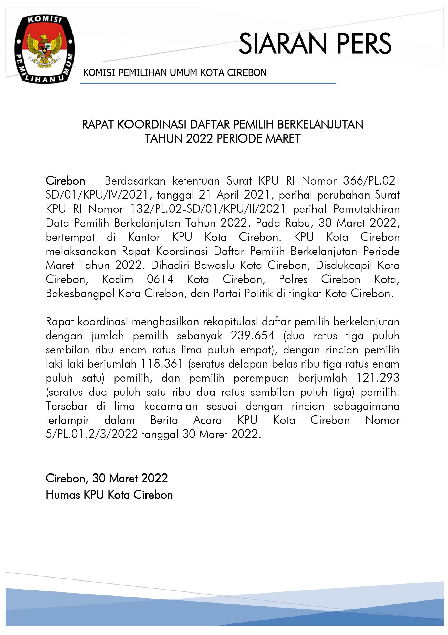 Cirebon, kota-cirebon.kpu.go.id - KPU Kota Cirebon melakukan pertemuan dengan Pengurus DPD Partai Persatuan Indonesia Kota Cirebon, Rabu (6/4/2022). Pertemuan ini dalam rangka Sosialisasi Keputusan KPU RI Nomor 21 Tahun 2022 tentang Hari dan Tanggal Pemungutan Suara pada Pemilihan Umum Presiden dan Wakil Presiden, Anggota DPR, Anggota DPD, Anggota DPRD Provinsi, dan Anggota DPRD Kabupaten/Kota Serentak Tahun 2024, Rabu, 14 Februari 2024. Selain itu, pertemuan ini juga membahas koordinasi persiapan Pemilu dan Pemilihan Serentak Tahun 2024. Perkiraan tahapan pendaftaran, verifikasi, dan penetapan Peserta Pemilu dimulai Bulan Juli-Desember 2022. Sementara itu, untuk penetapan jumlah kursi dan daerah pemilihan dimulai Bulan Oktober 2022-Februari 2023. Selain itu, untuk pencalonan Presiden dan Wakil Presiden serta anggota DPR, DPD, DPRD provinsi, dan kabupaten/kota dimulai Bulan Desember 2022-November 2023. KPU Kota Cirebon sudah mencoba membuat simulasi Daerah Pemilihan Pemilu Tahun 2024. Simulasi yang telah dibuat memperhatikan 7 prinsip penataan dapil yaitu kesetaraan suara, ketaatan pada sistem pemilu yang proporsional, proporsional, integralitas wilayah, coterminus, kohesivitas, dan kesinambungan. KPU Kota Cirebon telah membuat 4 simulasi dapil, dari hasil simulasi tersebut terdapat potensi Dapil Kota Cirebon pada Pemilu 2024 berubah yang disebabkan oleh pertambahan jumlah penduduk khususnya di Kecamatan Harjamukti. Simulasi pertama dengan mempertahankan komposisi 3 Dapil Pemilu 2019, menghasilkan Dapil 1 Kecamatan Kejaksan dan Lemahwungkuk 11 kursi, Dapil 2 Kecamatan Harjamukti 13 kursi, dan Dapil 3 Kecamatan Pekalipan dan Kesambi 11 kursi. Dengan hasil penghitungan tersebut, Dapil 2 Kecamatan Harjamukti dengan 13 kursi tidak sesuai dengan ketentuan perundang-undangan, karena paling banyak 12 kursi dalam 1 Dapil. Simulasi kedua 4 Dapil dengan membagi Kecamatan Harjamukti menjadi 2 Dapil, sehingga komposisinya yaitu Dapil 1 Kecamatan Kejaksaan dan Lemahwungkuk 11 kursi, Dapil 2 Harjamukti 1 (Kelurahan Harjamukti, Kelurahan Larangan dan Kelurahan Kecapi) 7 kursi, Dapil 3 Harjamukti 2 (Kelurahan Kalijaga dan Kelurahan Argasunya) 6 kursi, dan Dapil 4 Kecamatan Pekalipan dan Kesambi 11 kursi. Simulasi ketiga yaitu dengan 5 Dapil dengan komposisi Dapil 1 Kecamatan Kejaksan dan Pekalipan 8 kursi, Dapil 2 Kecamatan Lemahwungkuk 6 kursi, Dapil 3 Harjamukti 1 (Kelurahan Harjamukti, Kelurahan Larangan dan Kelurahan Kecapi) 7 kursi, Dapil 4 Harjamukti 2 (Kelurahan Kalijaga dan Kelurahan Argasunya) 6 kursi, dan Dapil 5 Kecamatan Kesambi 8 kursi. Simulasi keempat dengan 6 Dapil, komposisi Dapilnya yaitu Dapil 1 Kecamatan Kejaksan 5 kursi, Dapil 2 Kecamatan Lemahwungkuk 6 kursi, Dapil 3 Harjamukti 1 (Kelurahan Harjamukti, Kelurahan Larangan dan Kelurahan Kecapi) 7 kursi, Dapil 4 Harjamukti 2 (Kelurahan Kalijaga dan Kelurahan Argasunya) 6 kursi, Dapil 5 Kecamatan Pekalipan 3 kursi dan Dapil 6 Kecamatan Kesambi 8 kursi.