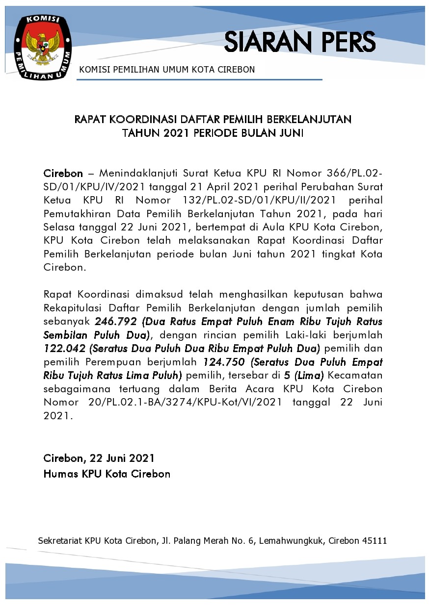 Cirebon, kota-cirebon.kpu.go.id - Rabu, 30 Juni 2021, bertempat di Aula KPU Kota Cirebon Jalan Palang Merah No. 6, Lemahwungkuk, Kota Cirebon, KPU Kota Cirebon mengundang Bawaslu Kota Cirebon dalam rangka menjalin koordinasi dan komunikasi serta mempererat silaturahmi sebagai penyelenggara Pemilu dan Pemilihan di tingkat Kota Cirebon. KPU Kota Cirebon melalui Ketua, Didi Nursidi didampingi 4 Komisioner lainnya yaitu Mardeko, Dedi Haerudi, Nur Dewi Kurniyawati dan Hasbi Falahi menyambut rombongan Bawaslu Kota Cirebon yang hadir secara lengkap yaitu Ketua Bawaslu Kota Cirebon, Mohamad Joharudin, dan 2 Anggota Bawaslu Kota Cirebon, Supriyan dan Devi Siti Sihatul Afiah, didampingi jajaran Sekretariat. Pertemuan berlangsung dengan hangat, membahas seputar kelembagaan penyelenggara, informasi dan perkembangan terkini terkait Pemilu dan Pemilihan Serentak yang akan dilaksanakan tahun 2024, terutama berkenaan dengan tahapan yang akan berlangsung selama 25 bulan mulai dari tingkat pusat sampai daerah. KPU Kota Cirebon dan Bawaslu Kota Cirebon sepakat untuk terus melakukan penguatan komunikasi, berkolaborasi dan kerja sama dalam peningkatan partisipasi masyarakat dan kemitraan dengan lembaga dan instansi terkait yang ada di Kota Cirebon, baik selama pra tahapan, tahapan dan pasca tahapan Pemilu dan Pemilihan, sehingga terbangun sinergi positif dan persepsi yang sama tentang berbagai teknis tahapan, agar seluruh tahapan berjalan aman, lancar dan kondusif. (Media Center)