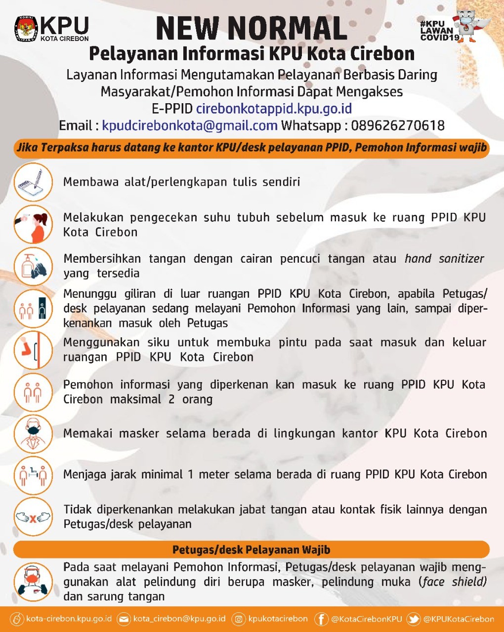 Jika terpaksa harus datang ke Kantor atau desk pelayanan PPID, Pemohon Informasi wajib membawa alat tulis sendiri, melakukan pengecekan suhu tubuh sebelum masuk ke ruang PPID KPU Kota Cirebon, mencuci tangan dengan sabun diair yang mengalir, menunggu giliran di luar ruangan PPID KPU Kota Cirebon, apabila petugas atau desk pelayanan sedang melayani Pemohon Informasi yang lain, sampai diperkenankan masuk oleh petugas, menggunakan siku untuk membuka pintu pada saat masuk dan keluar ruangan PPID KPU Kota Cirebon, Pemohon informasi yang diperkenan kan masuk ke ruang PPID KPU Kota Cirebon maksimal 2 orang, memakai masker selama berada di lingkungan kantor KPU Kota Cirebon, menjaga jarak minimal 1 meter selama berada di ruang PPID KPU Kota Cirebon, tidak diperkenankan melakukan jabat tangan atau kontak fisik lainnya dengan Petugas/desk pelayanan.