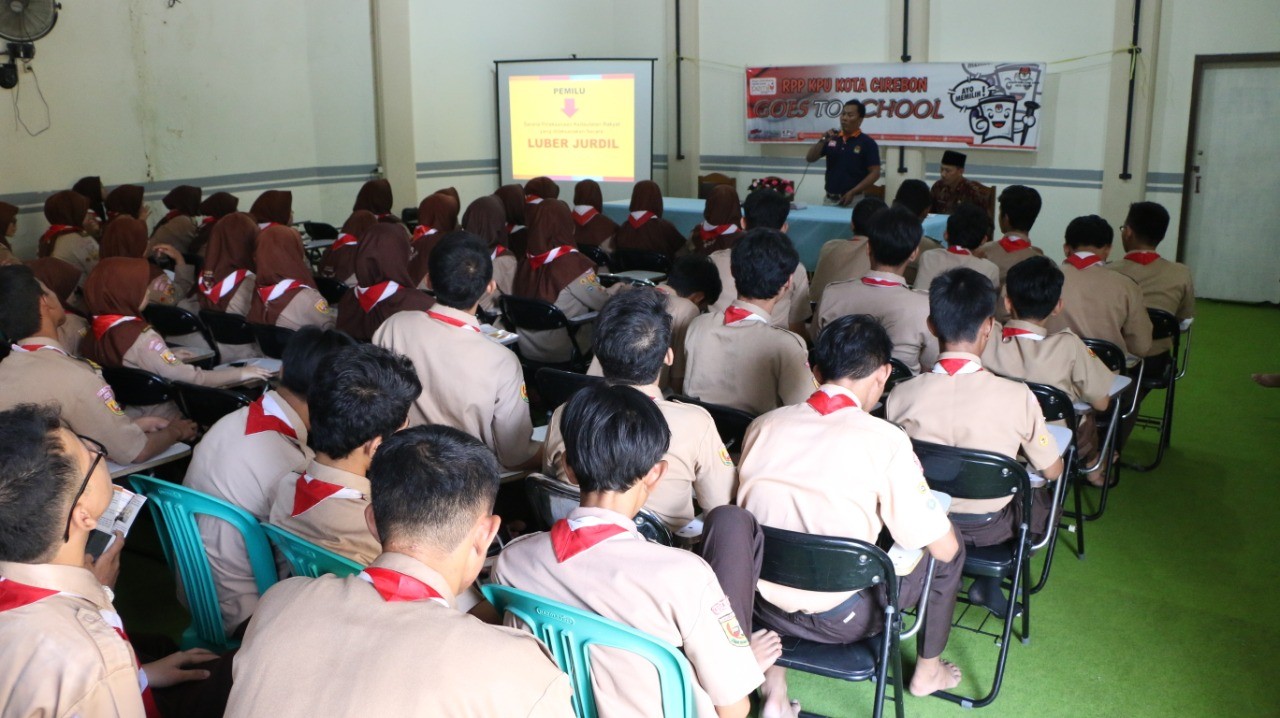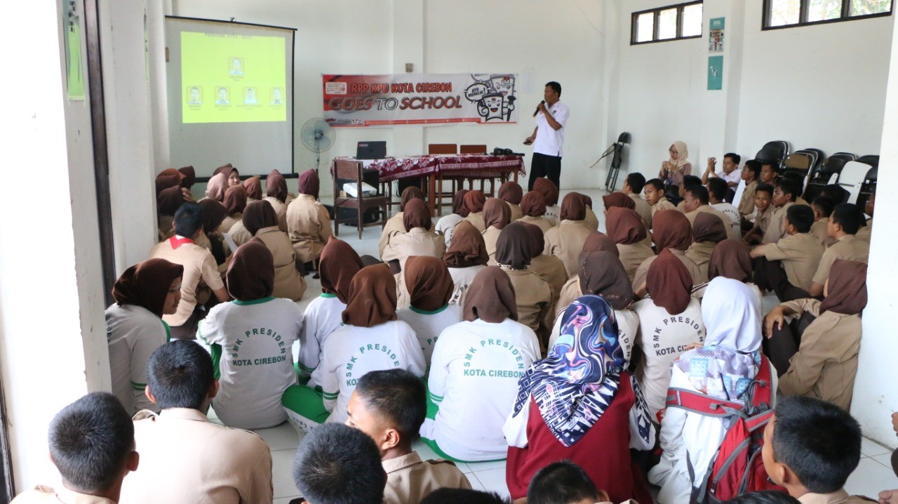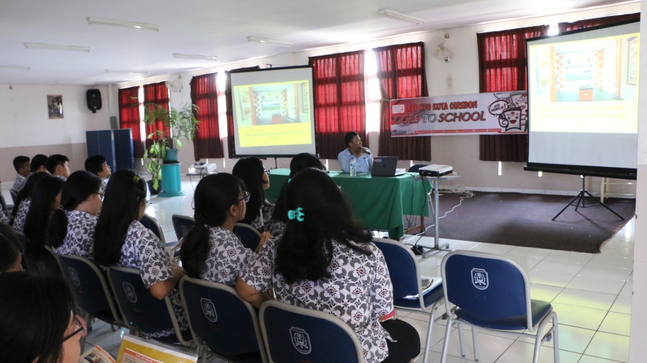 Cirebon, kota-cirebon.kpu.go.id - Dalam rangka pengenalan Rumah Pintar Pemilu (RPP) KPU Kota Cirebon sekaligus Eduakasi kepada para Pemilih Pemula, KPU Kota Cirebon yang diwakilkan oleh Anggota KPU Divisi Sosialisasi, Pendidikan Pemilih, Parmas dan SDM (Dedi Haerudi) melaksanakan kegiatan “RPP KPU Kota Cirebon Goes to School” ke SMK Muhammadiyah Kota Cirebon di Jalan Syarif Abdurrahman No.49, Kota Cirebon, Senin (28/10).