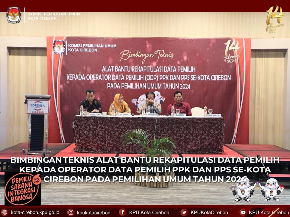 Cirebon, kota-cirebon.kpu.go.id – Komisi Pemilihan Umum Kota Cirebon menyelenggarakan Bimbingan Teknis Alat Bantu Rekapitulasi Data Pemilih Kepada Operator Data Pemilih PPK dan PPS se-Kota Cirebon pada Pemilihan Umum Tahun 2024, Rabu (22/3). Bimbingan teknis dibuka oleh Ketua KPU Kota Cirebon, Didi Nursidi. Dalam sambutannya, Ketua menyampaikan bahwa kegiatan ini sangat penting dan berharap dapat diikuti para peserta (operator data pemilih) PPK dan PPS dengan baik. Berharap dengan adanya alat bantu rekapitulasi data pemilih ini proses penyusunan daftar pemilih Pemilihan Umum Tahun 2024 akan berjalan dengan lancar.