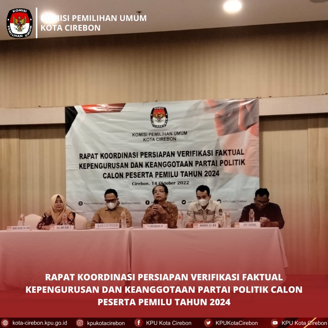 Cirebon, kota-cirebon.kpu.go.id - Berkenaan dengan akan dilaksanakannya Verifikasi Faktual terhadap Kepengurusan dan Keanggotaan Partai Politik Calon Peserta Pemilu Tahun 2024, Komisi Pemilihan Umum Kota Cirebon menyelenggarakan Rapat Koordinasi Persiapan Verifikasi Faktual Kepengurusan dan Keanggotaan Partai Politik Calon Peserta Pemilu Tahun 2024, Jumat (14/10).