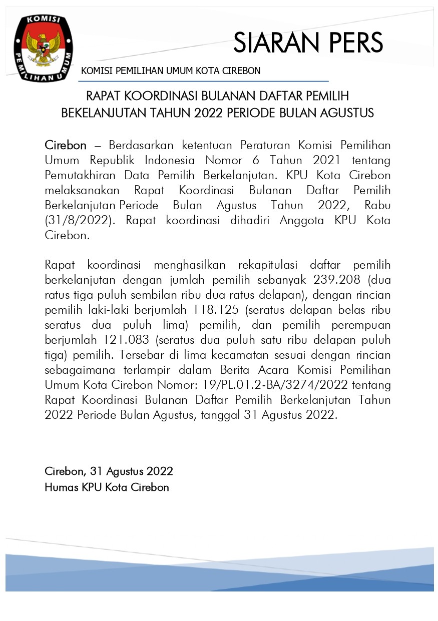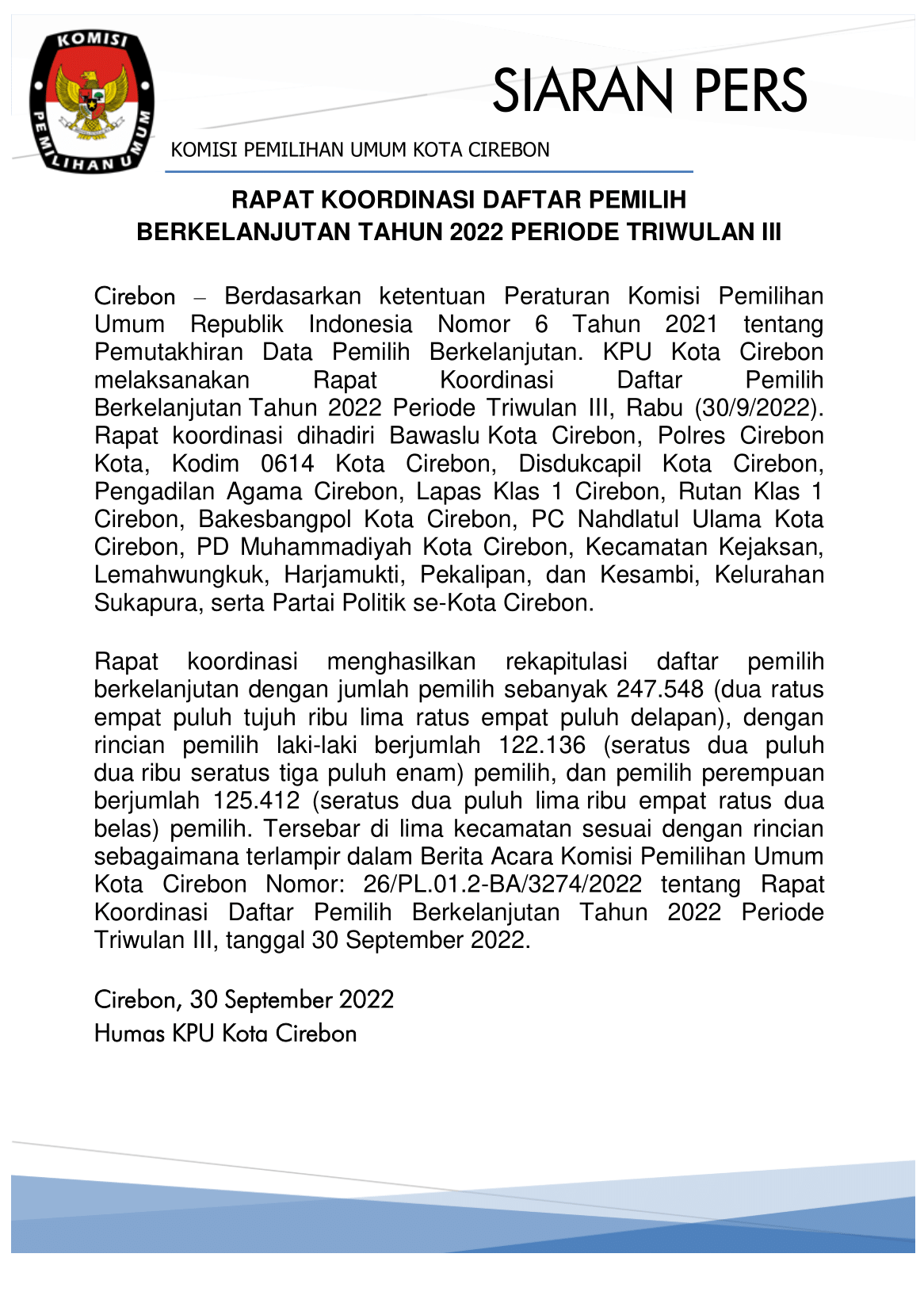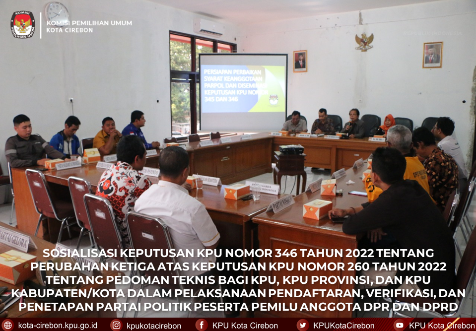 Cirebon, kota-cirebon.kpu.go.id - Berkenaan dengan telah ditetapkannya Keputusan KPU Nomor 384 Tahun 2022 tentang Perubahan Keempat Atas Keputusan KPU Nomor 260 Tahun 2022 Tentang Pedoman Teknis Bagi KPU, KPU Provinsi, dan KPU Kabupaten/Kota Dalam Pelaksanaan Pendaftaran, Verifikasi, dan Penetapan Partai Politik Peserta Pemilu Anggota DPR dan DPRD, KPU Kota Cirebon melakukan Rapat Koordinasi Persiapan Verifikasi Faktual dan Diseminasi Keputusan KPU Nomor 384 Tahun 2022, Senin (10/10). Rapat ini dihadiri Perwakilan dari Kepolisian Resor Cirebon Kota, Bawaslu Kota Cirebon, Disdukcapil Kota Cirebon, Bakesbangpol Kota Cirebon, dan Partai Politik Calon Peserta Pemilu Tahun 2024 se-Kota Cirebon. Acara dibuka oleh Ketua KPU Kota Cirebon, dalam sambutannya terkait tahapan Pemilu yang diharapkan menghasilkan output yang dipahami sesuai prosedur undang-undang dan Peraturan KPU. KPU mendesain dan mengupayakan Pemilu yang berkualitas dan membuat hajat demokrasi yang sukses. Acara dilanjutkan oleh Moderator, Hasbi Falahi, dengan paparan dari narasumber yaitu Ketua Bawaslu Kota Cirebon, Moh. Joharudin. Dalam paparannya, Ketua Bawaslu Kota Cirebon menjelaskan terkait tanggapan masyarakat, dimana masyarakat dapat melaporkan baik ke Bawaslu ataupun ke KPU.